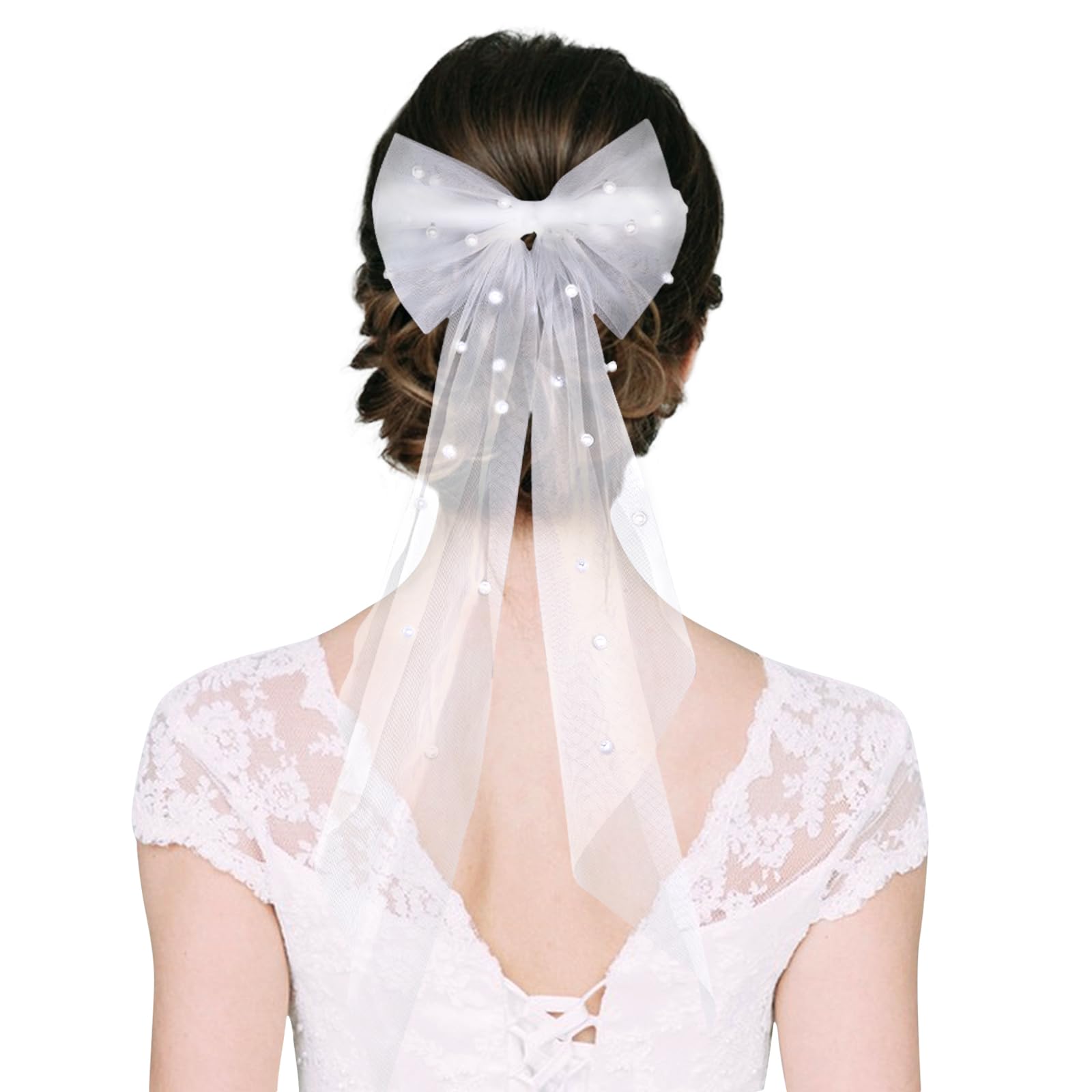 ORUZA Bridal Bow Veil White Pearl Hair Clip Wedding Veil with Barrette Hair Clips Hair Accessories for Bridal Shower Bachelorette Party