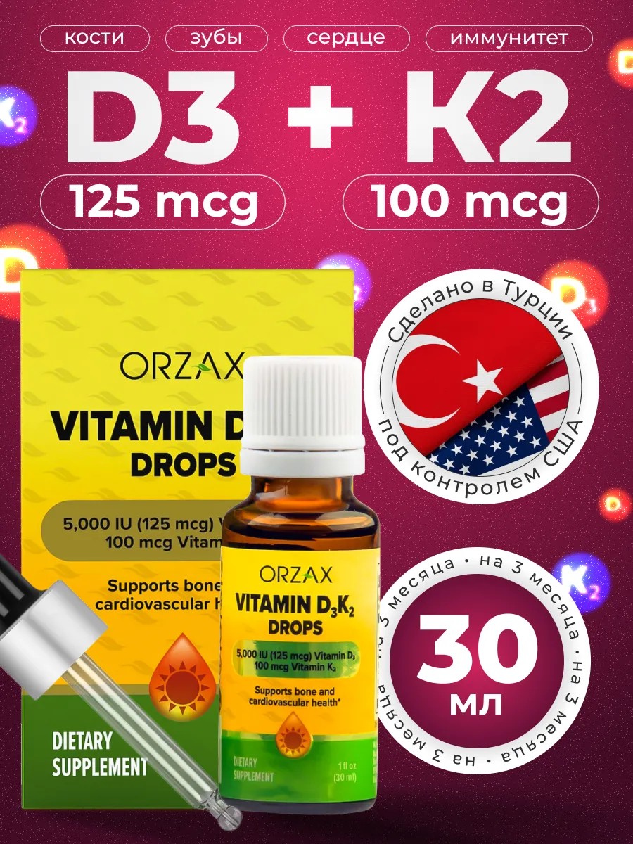 Vitamin D3K2 от турецкого бренда Orzax - эффективные бады, разработанные для здоровья всей семьи. Капли включают высокую концентрацию холекальциферола (1000 международных единиц) и менахинона-7 (100 мкг). Пищевая добавка полезна для женского, мужского и детского организма. Натуральная формула продукта, состоящая из комбинации Д3 и К2, обеспечивает максимальную эффективность в укреплении иммунитета, костей и зубов, поддержании здорового сердца и сосудов. Витамин Д играет важнейшую роль в регуляции уровня кальция в крови, а K2 предотвращает его отложение. Препарат улучшает настроение и когнитивные способности, способствует нормальному функционированию мышц и суставов, повышая результативность спортивных тренировок и выносливость, поддерживает сердечно-сосудистую систему, уменьшает риск возникновения судорог и рахита у детей. Форма выпуска витаминного комплекса д3к2 удобна в приеме, как таблетки или капсулы. Жидкий бад подходит для взрослых женщин, мужчин, пожилых и подростков. Беременным девушкам и кормящим мамам, перед началом применения мультивитамина, следует проконсультироваться с врачом. Товар, произведенный в Турции, не содержит глютен, сахар и лактозу. Флакон поставляется с пипеткой, позволяющей точно дозировать продукцию. ПопробуйтеОрзакс с d3 уже сегодня и почувствуйте разницу в своем самочувствии! Дозировку можно регулировать ( 5000, 2000).