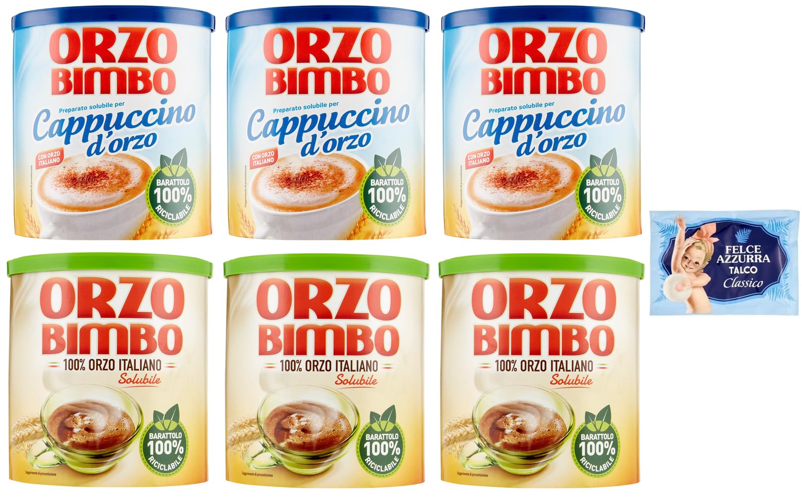 Pack of 3 bottles Orzo Bimbo Cappuccino D'orzo Solubile, soluble barley cappuccino - A caffeine-free alternative of 150 g. Instant barley cappuccino is a delicate and balanced drink, perfect to start the day with a sweet wake-up call like in a bar. Made from skimmed milk powder and roasted, dissolved into a fine, light powder that dissolves easily in hot water. Orzo Bimbo Barley Cappuccino is the ideal choice for those looking for a caffeine-free alternative to traditional cappuccino. A warm, creamy drink suitable for children and adults. You will find it in a 150 g pot which will allow you to prepare approximately 10 cups of barley cappuccino. Pack of 3 Orzo Bimbo Solubile, soluble barley, Italian barley, a caffeine-free alternative of 120 g of soluble barley is a perfect product for anyone who is looking for an alternative to coffee, but does not want to give up the taste and effect of a cup of steaming hot drink. Soluble bimbo barley comes in the form of finely ground powder, obtained by processing selected and roasted barley grains. The pleasant taste of malt and the absence of caffeine make it a suitable drink at any time of the day, from breakfast to afternoon break.Orzo Bimbo Soluble, 3-pack, soluble barley, Italian barley, a caffeine-free alternative, 120g. Orzo Bimbo Cappuccino D'orzo Soluble, Soluble Cappuccino, soluble barley cappuccino, a caffeine-free alternative, 150g. 1 pack of Felce Azzurra talcum powder - 100g sachet. Lot de 3 bouteilles Orzo Bimbo Cappuccino D'orzo Solubile, cappuccino soluble d'orge - Une alternative sans caféine de 150 g. Le cappuccino d'orge instantané est une boisson délicate et équilibrée, parfaite pour commencer la journée avec un réveil sucré comme dans un bar. Fabriqué à partir de lait écrémé en poudre et torréfié, dissous en une poudre fine et légère qui se dissout facilement dans l'eau chaude. Le cappuccino Orzo Bimbo à l'orge est le choix idéal pour ceux qui recherchent une alternative sans caféine au cappuccino traditionnel. Une boisson chaude et crémeuse adaptée aux enfants et aux adultes. Vous le trouverez dans un pot de 150 g qui vous permettra de préparer environ 10 tasses de cappuccino d'orge. Lot de 3 Orzo Bimbo Solubile, orge soluble, orge italienne, une alternative sans caféine de 120 g d'orge soluble est un produit parfait pour tous ceux qui recherchent une alternative au café, mais ne veulent pas renoncer au goût et à l'effet d'une tasse de boisson chaude vapeur. L'orge bimbo soluble se présente sous forme de poudre finement moulue, obtenue par le traitement de grains d'orge sélectionnés et grillés. Le goût agréable du malt et l'absence de caféine en font une boisson appropriée à tout moment de la journée, du petit déjeuner à la pause de l'après-midi.Orzo Bimbo Solubile, lot de 3, orge soluble, orge italienne, une alternative sans caféine, 120 g. Orzo Bimbo Cappuccino D'orzo Solubile, Cappuccino Soluble, Cappuccino d'orge soluble, une alternative sans caféine, 150 g. 1 paquet de poudre de talc Felce Azzurra - Sachet de 100 g.