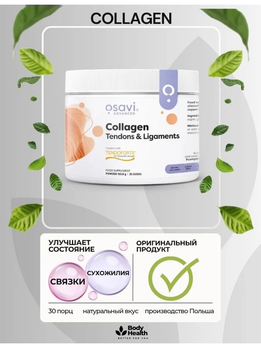 Osavi Collagen Peptides Tendons & Ligaments. Если вы хотите улучшить свою физическую форму и снизить риск травм опорно-двигательного аппарата, мы рекомендуем Collagen Tendons and Ligaments. Состояние как сухожилий, так и связок может ухудшаться с возрастом или быть вызвано частыми физическими нагрузками, связанными с высокой динамикой и повторяющимися движениями. Коллаген — это вещество, которое естественным образом встречается в организме человека и входит в состав примерно 1/3 его белков. В основном он содержится в костях, зубах, коже, мышцах, сухожилиях и связках. С возрастом количество продуцируемого коллагена, т.е. эндогенной продукции, снижается, что может привести к изменению структуры и функции тканей, из которых состоят сухожилия и связки, и это может негативно сказаться на нашей способности двигаться. Коллаген содержится в продуктах животного происхождения, а его источниками являются: пищевой желатин, костные бульоны, мясные и рыбные желе и субпродукты. Большинство из этих продуктов не рекомендуются в нашем рационе для повседневного употребления из-за высокого содержания холестерина и насыщенных жирных кислот. По этой причине мы можем поддерживать наше тело с помощью добавок коллагена. Коллаген для сухожилий и связок идеально подойдет людям, которые хотят комплексно заботиться о здоровье своих тканей, физически активным людям, занимающимся любым видом спорта (например, бегом, теннисом, плаванием, велоспортом). Добавка содержит 5 г пептидов коллагена в виде порошка с отличной растворимостью в каждой порции. Это идеальное дополнение к напиткам, смузи и другим блюдам, так как оно не имеет вкуса и запаха.
