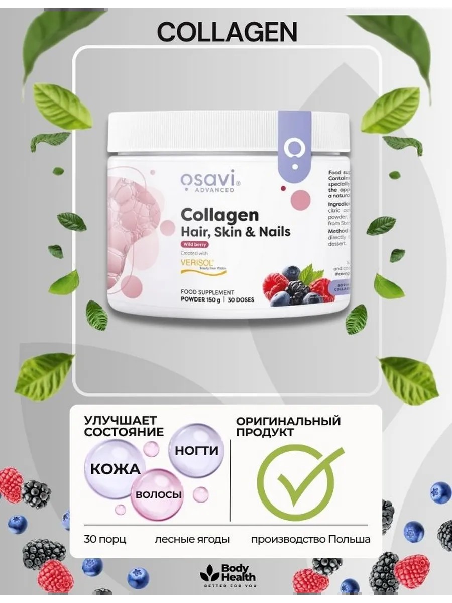 Osavi Collagen Hair, Skin and Nails- Коллаген для волос, кожи и ногтей — лучший коллаген для людей, которые хотели бы уменьшить боль в суставах, уменьшить морщины, способствовать росту мышц и помочь в регулировании веса. Коллаген часто называют белком молодости, потому что это самый распространенный белок. Это основной компонент соединительной ткани, из которой состоят некоторые части тела, включая сухожилия, связки, кожу и мышцы. К сожалению, с возрастом существующий коллаген разрушается, и организму становится все труднее производить его в большем количестве. Когда уровень коллагена падает, у вас могут появиться такие симптомы, как мышечная слабость, боль в суставах, жесткость сухожилий или связок, снижение эластичности кожи.