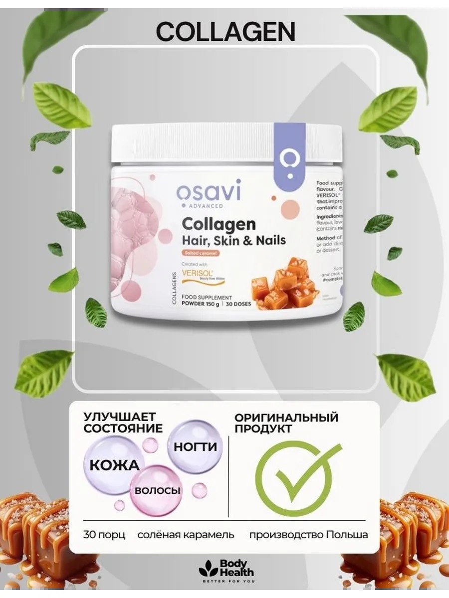 Osavi Collagen Hair, Skin and Nails- Коллаген для волос, кожи и ногтей — лучший коллаген для людей, которые хотели бы уменьшить боль в суставах, уменьшить морщины, способствовать росту мышц и помочь в регулировании веса. Коллаген часто называют белком молодости, потому что это самый распространенный белок. Это основной компонент соединительной ткани, из которой состоят некоторые части тела, включая сухожилия, связки, кожу и мышцы. К сожалению, с возрастом существующий коллаген разрушается, и организму становится все труднее производить его в большем количестве. Когда уровень коллагена падает, у вас могут появиться такие симптомы, как мышечная слабость, боль в суставах, жесткость сухожилий или связок, снижение эластичности кожи.