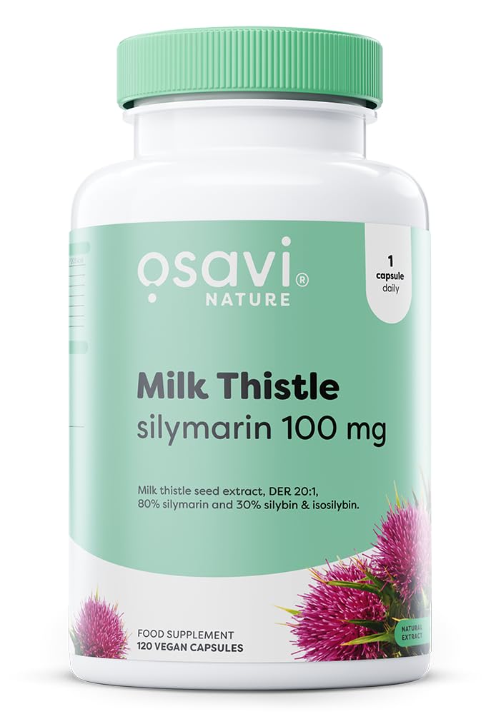Dietary supplement in the form of a hard capsule with standardized milk thistle extract, which supports normal liver function. Do you want to take care of your liver, which plays a role in proper food digestion, energy production, and detoxification of the body? In addition to introducing healthy eating habits, avoiding alcohol consumption, and regular physical activity, consider a milk thistle supplement. This plant contains many valuable ingredients that positively influence the proper functioning of the liver and biliary tract. Milk thistle has been known since ancient times and is currently a popular ingredient in dietary supplements. The extract from milk thistle seeds is a source of a complex of flavonolignans called silymarin, of which silybin is one of the most active components. Silybin is a natural antioxidant that has a beneficial effect on our body. It works with the immune system and also helps stimulate liver cells to regenerate [1]. Silybin use has been associated with a reduction in insulin resistance, a decrease in fasting insulin and glucose levels, and a decrease in total cholesterol, LDL fraction, and triglycerides [2]. Silybin can modulate the expression of genes involved in bile acid homeostasis, which is essential for proper fat digestion, and also has a positive effect on the maintenance of normal bile acid and AST transaminases [3,4]. The activity of these enzymes is determined in the so-called liver test, which is used to diagnose liver damage. Our liver is constantly exposed to adverse factors such as an unhealthy lifestyle, toxins, alcohol consumption, and medications. Therefore, it is worth considering a supplement to support its proper functioning. Our Milk Thistle, 100 mg Silymarin, is a dietary supplement containing 20:1 milk thistle seed extract (Silybum marianum), standardized to at least 80 silymarin and 30 silybin and isosilibin. A daily dose of one capsule provides 125 mg of seed extract, including at least 100 mg of silymarin. This amount of extract is equivalent to 2.5 g of milk thistle seeds. The product is suitable for vegans and vegetarians. Milk Thistle supports the proper function of your liver, so you can enjoy good health and well-being. Take care of your liver with Milk Thistle! Why would anyone benefit from Milk Thistle, 100 mg Silymarin? - Milk Thistle supports normal liver and bile function. Milk Thistle contributes to the regeneration of liver cells. About Milk Thistle, 100 mg Silymarin capsules? Contains milk thistle (Silybum marianum) seed extract, 20:1, standardized for at least 80 silymarin and 30 silybin isosileilbin. Lactose-free, genetically modified packaging. Packaging made from Biopet (30 of the plastic comes from sugar cane). INGREDIENTS: Inulin, milk thistle (Silybum marianum) seed extract, peel (hydroxypropyl methylcellulose). DIRECTIONS: Take 1 capsule after a meal. SAFETY WARNING: Not recommended for children or during pregnancy and breastfeeding. Store in a dark, dry place at room temperature, out of the reach of young children. Store in a cool, dry place. This product is not a substitute for a balanced and varied diet. Do not exceed the recommended daily dose. See moreSupports the immune system.Osavi Milk Thistle, Silymarin 100mg - 120 vegan caps Voedingssupplement in de vorm van een harde capsule met gestandaardiseerde melkdistel-extract, dat normale leverfuncties ondersteunt. Wil je voor je lever zorgen, die een rol speelt bij de juiste vertering van voedsel, energieproductie en ontgifting van het lichaam? Naast het introduceren van gezonde eetgewoonten, het vermijden van alcoholgebruik en regelmatige fysieke activiteit, overweeg het supplement met melkdistels. Deze plant bevat veel waardevolle ingrediënten die de goede werking van de lever- en galwegen positief beïnvloeden. Milk Thistle is al sinds de oudheid bekend en is momenteel een populair ingrediënt in voedingssupplementen. Het extract uit melkdistelzaden is een bron van een complex van flavonolignanen, silymarine genoemd, waarvan silybine een van de meest actieve componenten is. Silybin is een natuurlijke antioxidant die een gunstig effect heeft op ons lichaam. Het werkt samen met het immuunsysteem en neemt ook deel aan stimulerende levercellen om te regenereren [1]. Het gebruik van Silybin werd geassocieerd met een vermindering van de insulineresistentie, een afname van nuchtere insuline- en glucosespiegels en een afname van totaal cholesterol, LDL fractie en triglyceriden [2]. Silybin kan de expressie van genen moduleren die betrokken zijn bij de homeostase van galzuren die essentieel zijn voor de juiste vertering van vetten, en ook een positief effect hebben op het behoud van normale oud- en AST-transaminasen [3,4]. De activiteit van deze enzymen wordt bepaald in de zogenaamde levertest, die wordt gebruikt om leverschade te diagnosticeren. Onze lever wordt voortdurend blootgesteld aan ongunstige factoren zoals ongezonde levensstijl, toxines, alcoholgebruik en medicijnen. Daarom is het de moeite waard om een aanvulling te overwegen om de juiste werking te ondersteunen. Onze melkdistel, 100 mg silymarine, is een voedingssupplement met een extract van melkdistelzaden (Silybum marianum), 20: 1, gestandaardiseerd op min. 80 silymarine en 30 silybine en isosileilbine. Een dagelijkse dosis van één capsule levert 125 mg zaadextract, inclusief ten minste 100 mg silymarine. Deze hoeveelheid extract komt overeen met 2,5 g melkdistelzaden. Het product is geschikt voor veganisten en vegetariërs. Milk Thistle ondersteunt de juiste functies van je lever, zodat je van een goede gezondheid en welzijn kunt genieten. Zorg voor je lever met melkdistel! Waarom zou iemand profiteren van melkdistels, silymarine 100 mg? - Melkdistel ondersteunt de normale lever- en galfunctie. Melkthistle draagt bij aan de regeneratie van levercellen. Over capsules melkthistle, silymarine 100 mg? Bevat melkdistel (Silybum Marianum) zaadextract, 20: 1, gestandaardiseerd voor min. 80 silymarijn