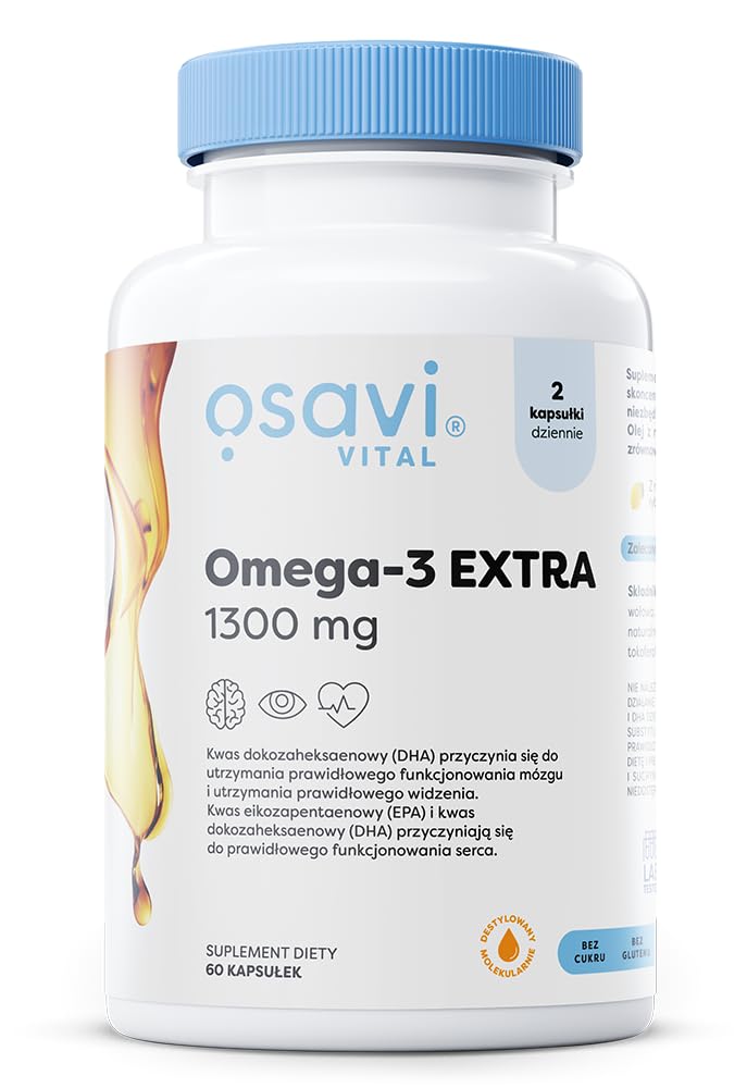 A dietary supplement in the form of a softgel capsule with highly concentrated and purified fish oil. Contains essential fatty acids (DHA and EPA). This oil is sourced from sustainably caught pelagic fish (anchovies). Regular fish consumption is the best way to provide the body with the most beneficial acids. This group includes essential omega-3 fatty acids, which have anti-inflammatory properties and contribute to the proper functioning of the heart, circulatory system, brain, and vision [1,2]. Our bodies cannot produce omega-3 fatty acids, so we must ensure a regular intake. Omega-3 fatty acids are incorporated into cell membranes in all body tissues, making them essential for maintaining health [3]. They participate in signal transmission between cells and are responsible for cell membrane fluidity and maintaining their structure [4]. Omega-3 fatty acids support nervous system function by regulating the central nervous system and neurotransmitters [5]. They are essential for eye and brain development, which is particularly important for children, and by increg the concentration of omega-3 fatty acids in the brain, they also help maintain normal cognitive function well into old age [6]. Omega-3 fatty acids are also responsible for the proper functioning of the retina, supporting your vision [7]. High levels of omega-3 fatty acids contribute to the prevention of cardiovascular and circulatory health through their positive impact on cholesterol levels, rhythm, plaque aggregation, and anti-inflammatory effects [8]. Eicosapentaenoic acid (EPA) and docosahexaenoic acid (DHA) are considered the most valuable fatty acids for health. Rich sources of these acids are mainly animal products: salmon, sardines, mackerel, herring, eggs, oysters, as well as fish oil and algae oil. To meet our needs for these valuable acids, we should consume marine fish oil twice a week [9]. Our bodies can produce EPA and DHA from the essential unsaturated fatty acid ALA, which is consumed from plant foods such as flaxseed oil and flaxseed, rapeseed oil, chia seeds, hazelnuts, soybeans, spinach, and sprouts. Unfortunately, this conversion is not always sufficient, and relying solely on ALA sources in the diet can lead to deficiencies [10]. We recommend a dietary supplement containing highly purified fish oil, rich in some of the highest doses of the omega-3 fatty acids EPA and DHA on the market. A daily serving of two capsules provides 2g of fish oil from sustainably caught pelagic fish, containing 1300mg of omega-3 fatty acids, enriched with a delicious lemon flavor that eliminates fish after cooking. This provides your body with 720mg of DHA and 480mg of EPA daily. Take care of your health with omega-3 fatty acids. Why is it worth supplementing with Omega-3 EXTRA 1300mg? - Docosahexaenoic acid (DHA) contributes to the maintenance of normal brain function and normal vision. - Eicosapentaenoic acid (EPA) and docosahexaenoic acid (DHA) contribute to the normal function of the heart. What distinguishes Omega-3 EXTRA 1300mg capsules? - One of the highest servings of omega-3 on the market. - Specially developed concentrate of omega-3 acids obtained from wild-caught fish oil (anchovies). - Pelagic fish oil from sustainable fish farms (Amigo) Certified by the sea. - High content of essential unsaturated fatty acids EPA and DHA. - Highly purified fish oil produced in accordance with the GOED (World Organization for EPA and DHA) monograph. - Natural lemon flavor that reduces fishy odors. Aftertaste. - Oil produced using molecular distillation. - Sugar-free, gluten-free, lactose-free, soy-free, GMO-free. Packaging change – Ecologically and responsibly. With a focus on the environment and quality, we are gradually introducing new packaging. Instead of the previous BioPET, we now use rPET bottles (50 recycled plastic) and standard PET – both are fully recyclable. During the transition period, you may receive the product in different packaging variants, but we always ensure their high quality and safety. Thank you for your understanding and for caring for our planet together!Immune system support.Osavi Omega-3 Extra Molecularly Distilled (Vital), 1300mg (Cytryna) - 60 softgelsDESCRIPTION DU PRODUIT Un complément alimentaire dans la forme d'une capsule softgel avec de l'huile de poisson hautement concentrée et purifiée. Contient des acides gras essentiels (DHA et EPA). Cette huile provient de poissons pélagiques sustainably caught (anchois). La consommation régulière de poisson est la meilleure façon de fournir au corps des acides les plus appréciables. Ce groupe comprend des acides gras oméga-3 essentiels, qui ont des propriétés anti-inflammatoires et contribuent au bon fonctionnement du cœur, du système circulatoire, du brain et de la vision [1,2]. Nos bodies cannot produisent des acides gras oméga-3, donc nous devons nous assurer que leur intake régulier est nécessaire. Les acides gras oméga-3 sont incorporés dans des membranes cellulaires dans tous les tissus corporels, ce qui les rend essentiels pour maintenir la santé [3]. Ils participent à la transmission des signaux entre les cellules et sont responsables de la fluidité des membranes cellulaires et du maintien de leur structure[4]. Les acides gras oméga-3 supportent la fonction du système nervous en régulant le système nervous central et les neurotransmetteurs [5]. Ils sont essentiels pour le développement des yeux et du brain, ce qui est particulièrement important pour les enfants, et en augmentant la concentration des acides gras oméga-3 dans le brain, ils aident également à maintenir une fonction cognitive normale bien dans le vieil âge [6]. Les acides gras oméga-3 sont également responsables du bon fonctionnement de la rétine, supportant votre vision [7]. Un taux élevé d'acides gras oméga-3 contribue à la prévention du système de santé cardiaque et circulatoire grâce à leur impact positif sur les niveaux de cholestérol,
