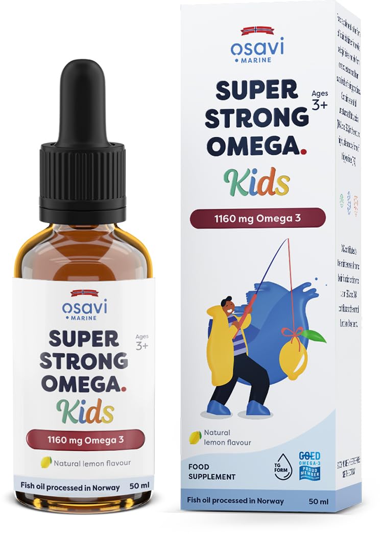 Dietary supplement in liquid form obtained from wild pelagic fish (mainly anchovies) from sustainable fishing practices. Contains essential unsaturated fatty acids (DHA and EPA) in the highly absorbable natural form of triglycerides (TG). Do you want to ensure the healthy development of your child? Provide them with a daily dose of exercise and make sure they eat a balanced diet, which should include omega-3 fatty acids. We realize that encouraging your child to eat products rich in these valuable ingredients is sometimes difficult, so we have a solution for you! Supplement their diet by giving them Super Strong Omega Kids 1160 mg Omega-3 Fish Oil, which contains essential fatty acids that contribute to the correct development of brain structure and function, eyesight and also heart function. Fish oil is a source of essential omega-3 unsaturated fatty acids, including the fatty acids EPA (eicosapentaenoic acid) and DHA (docosahexaenoic acid), which a child's body cannot produce on its own in sufficient quantities for its proper functioning, so we must provide them with the diet. Omega-3 fatty acids play an important role in proper growth and development from an early age, which affects health in adulthood. They are part of cell membranes, mediate cell signaling and are essential for the proper functioning of the child's nervous system as it learns about the world and receives various external stimuli. The acids EPA and DHA influence cardiovascular health and heart function during movement and rest. Fish oil consumption by children has a positive effect on cholesterol and triglyceride levels [1]. EPA and DHA acids support the proper development of the child's immune system, who is exposed to numerous infections from a very young age [2]. DHA acids constitute the building blocks of the child's brain, influencing its functions such as learning and memory, and also help the child develop reaction speed [3]. In addition, they are part of the structure of the eye, contributing to good vision, which allows the child to experience the world in different colors. The best sources of EPA and DHA are marine fish such as salmon, cod, herring, mackerel or sardines. However, if your child is reluctant to eat these foods, fish oil supplementation is worth considering. Our children Omega Super Strong is a dietary supplement containing oil produced in Norway from sustainably caught pelagic fish (mainly anchovies). It contains a high concentration of essential fatty acids (DHA and EPA) in a highly digestible triglyceride (TG) form. It has a natural lemon flavor which gives a pleasant taste and makes it easy to take. A 2 ml serving, measured with a pipette, provides 1840 mg of fish oil, including up to 1160 mg of omega-3 fatty acids (580 mg EPA and 400 mg DHA). Ensure proper development of your child's brain, heart and eyesight with super strong omega kids. Why would anyone benefit from supplementing with Super Strength Omega Kids, 1160 mg Omega 3? - Docosahexaenoic acid (DHA) contributes to the maintenance of normal brain function and normal vision. Nbsp - eicosapentaenoic acid (EPA) and docosahexaenoic acid (DHA) contribute to the normal function of the heart, what is special about children's super strong omega, 1160 mg of omega 3? - Fish oil obtained from wild pelagic fish (mainly anchovies) from sustainable fishing practices (oil with a friend of the sea). - Highly purified product produced according to the Goed monograph (World Organization of EPA and DHA). - contains 1160 mg of omega-3 in 2 ml (including: 580 mg of EPA and 400 mg of DHA). - natural lemon flavor. - Free preservatives, colors and GMOs. - Easy to use dosage system via pipette. - Product made in Norway. INGREDIENTS Energy value, fat, including saturated fatty acids, including unsaturated fatty acids, carbohydrates, including sugars, including polyols, including starch, fiber, proteins, salt, fish oil, including omega-3 acids: min. , EPA (eicosapentaenoic acid) min., Dha (docosahexaenoic acid) min., Other omega-3 acids min., Fish oil from pelagic fish, natural lemon flavor, antioxidant: extract rich in tocopherol.Product made in Norway. Easy-to-use pipette dosing system. Free from preservatives, colorants, and GMOs. With natural lemon flavor. Contains 1160 mg of omega-3 per 2 ml (of which: 580 mg EPA and 400 mg DHA). A highly purified product manufactured in accordance with the GOED monograph (World Organization EPA and DHA Omega-3). Oil from sustainably caught pelagic fish (mainly anchovies) (Friend of the Sea certified oil). Supplément alimentaire sous forme de liquide obtenu à partir de poissons pélagiques sauvages (principalement des anchois) provenant de pratiques de pêche durables. Contient des acides gras insaturés essentiels (DHA et EPA) dans la forme naturelle hautement absorbable des triglycérides (TG). Souhaitez-vous assurer le bon développement de votre enfant? Fournissez-leur une dose quotidienne d'exercice et assurez-vous qu'ils mangent une alimentation équilibrée, qui devrait inclure des acides gras oméga-3. Nous sommes conscients qu'encourager votre enfant à manger des produits riches en ces ingrédients précieux est parfois difficile, nous avons donc une solution pour vous! Complétez leur alimentation en leur donnant des enfants oméga super forts 1160 mg d'huile de poisson oméga-3, qui contient des acides gras essentiels qui contribuent au développement correct de la structure et de la fonction du cerveau, de la vue et également de la fonction cardiaque. L'huile de poisson est une source d'acides gras non saturés oméga-3 essentiels, y compris l'acides gras EPA (acide eicosapentaénoïque) et le DHA (acide docosahexaénoïque), que le corps d'un enfant ne peut pas produire seul en quantité suffisante pour son bon fonctionnement, nous devons donc nous fournissez-leur le régime. Les acides gras oméga-3 jouent un rôle important dans la croissance et le développement appropriés dès le plus jeune âge, 