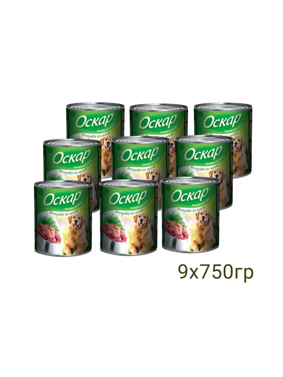 оскар консервы д взрослых собак ассорти из мяса 750г х 9шт
