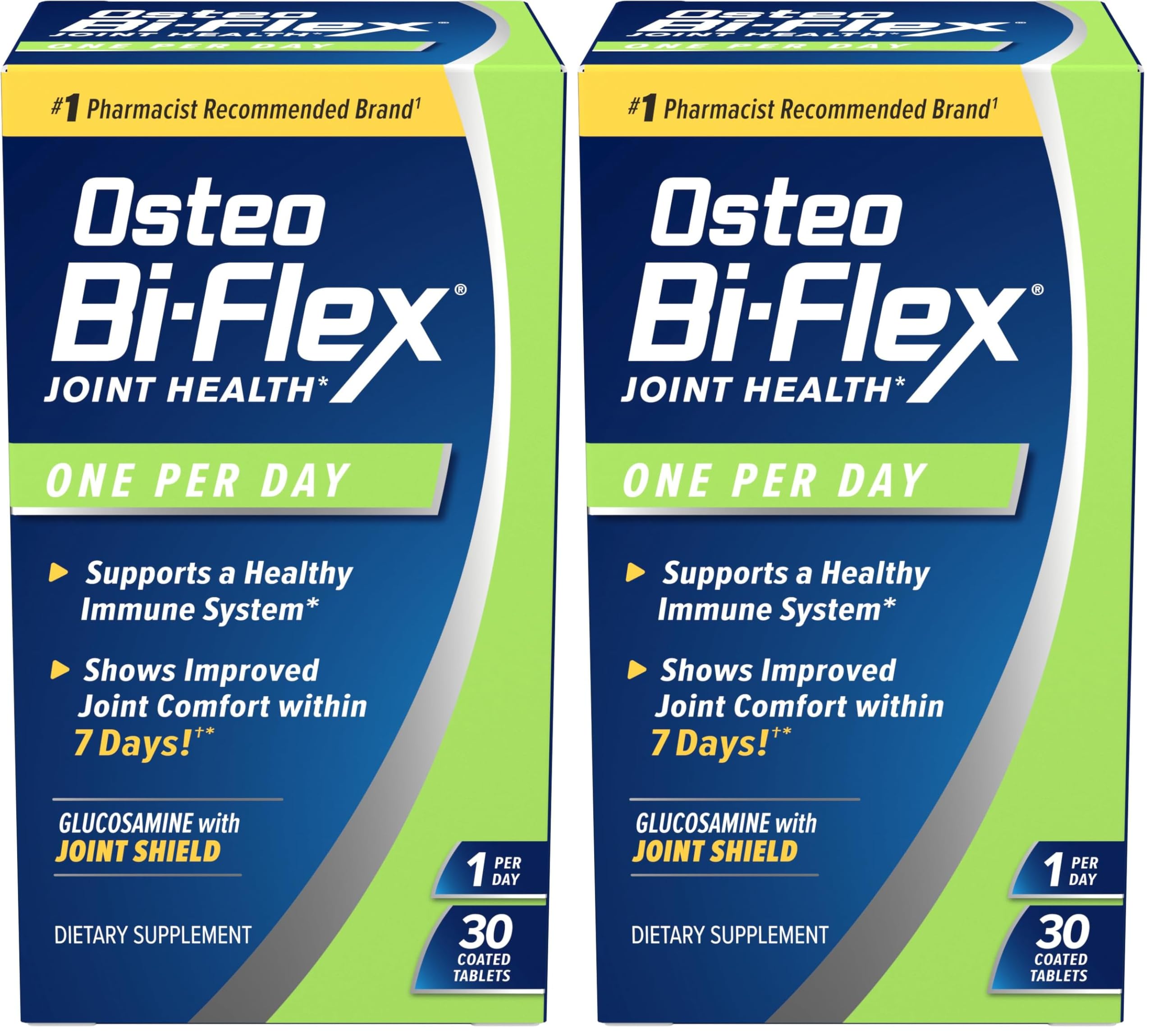 Includes Vitamin D to help maintain bone health in adults while providing immune support(1). Includes glucosamine chondroitin to nourish and strengthen your joints for the long term(1). Joint Shield 5-LOXIN Advanced is a clinically studied herbal extract that has been shown to improve joint comfort in 7 days(4)(1). Osteo Bi-Flex is the number1 pharmacist recommended joint care supplement brand1. One 30 count bottle of Osteo Bi-Flex One Per Day, Glucosamine Joint Health Supplement(1) with Vitamin D. The information below is per-pack only.