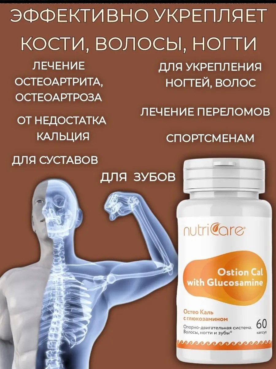 Остео Каль с Глюкозамином способствует восстановлению нормальной структуры костной и хрящевой тканей, тормозит прогрессирование дегенеративных процессов в суставах, позвоночнике. Способствует восстановлению функций и исчезновению болевого синдрома. Улучшает состояние ногтей, зубов, волос.