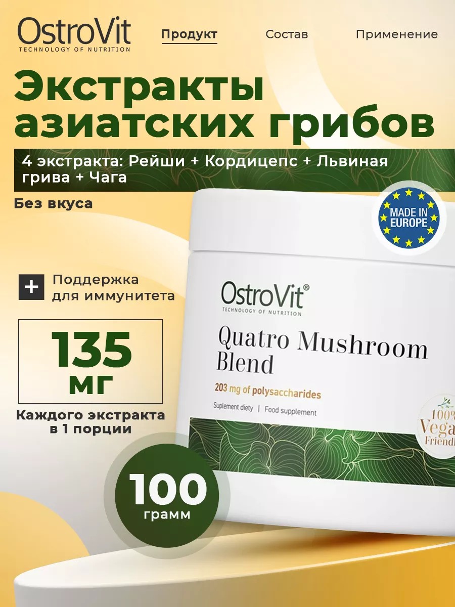 Смесь грибов Кватро ВЕГЕ 100 г, натуральный вкус Ostrovit, Quatro Mushroom Blend VEGE 100 g, Natural это уникальная комбинация экстрактов четырех различных грибов - рейши, львиной гривы, китайского кордицепса и чаги. Выпускается в удобной форме порошка и предназначен для людей, желающих дополнить свой рацион натуральными ценными ингредиентами. Также прием смеси грибов в качестве пищевых добавок способствует поддержке мозга и улучшения когнитивных функций. ПОЛЬЗА: стимулирует нервную систему и поддерживает здоровье мозга; борется со свободными радикалами – снимает воспаление и предотвращает окисление; стабилизирует эмоциональное состояние, уменьшает раздражительность; улучшает когнитивные функции, мышления и память; проявляет антигипергликемическую активность – снижает уровень сахара в крови; укрепляет иммунитет; улучшает пищеварение; грибная смесь вегетарианский и веганский продукт для веганов. Грибочки внутри этих капсул действуют как успокоительное против депрессии, а также обогащают организм нужными минералами. Плодовые тела грибов являются богатым источником биологически активных веществ - в грибе содержатся, в частности, нуклеотиды, аминокислоты, полисахариды, благодаря чему часто используются в качестве ингредиента пищевых добавок. Это натуральный препарат, который предназначен для взрослых мужчин и женщин. Набор вкусных капсул содержат ультра мощные и эффективные средства, которые помогают комплексно поддерживать диету, правильное питание ПП и полезную еду. Этот витаминный комплекс грибка гребечатого разработан специально для поддержания роста иммунитета, восстановления здоровья и красоты, у людей различных возрастных групп. Превосходная формула внутри баночки, основа для поддержания высокой энергии в организме, необходимой для активной жизни и спортивной тренировочной формы. Товар подходит для сильных спортсменов, диетического и спортивного пит (спортпит). Мужские и женские профессиональные пищевые добавки, помогут вам поддерживать баланс питательных веществ и увеличения энергии на целый день. Это незаменимый помощник для всех, кто стремится к здоровому образу жизни ЗОЖ, активному спорту и быстрому повышению имунитета, настоящий праздник для вашего организма. Благодаря хорошему качеству данного продукта, вы сможете ощутить приятное благополучие все его плюсы в любых условиях, является отличным подарком для тех, кто ценит свое время и заботится о своем уходе. ПРИМЕНЕНИE: Принимайте 1 порцию - 540 мг (1 мерный стаканчик) ежедневно во время еды, запивая водой. Пожалуйста, используйте мерный стаканчик, входящий в комплект (1 мл). ПРЕДУПРЕЖДЕНИE: Проконсультируйтесь с врачом перед применением пищевых добавок, если вы проходите курс лечения от какого-либо заболевания, а также в период беременности и лактации. Хранить в плотно закрытой упаковке в сухом, защищенном от прямых солнечных лучей, месте, недоступном для детей, при температуре не более 15-25°C.