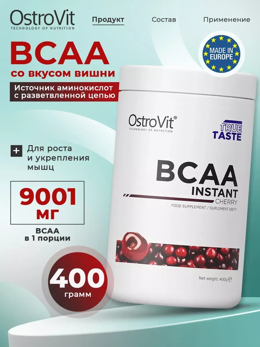 Ostrovit, BCAA Instant, банка с порошком (powder) 400 г, Вишня - это высококачественное спортивное питание. Сокращение от "Branch Chain Amino Acids" или "аминокислоты с разветвленной цепью". Этот комплексный порошок помогает стимулировать мышечный рост и подавлять мышечный катаболизм, включают в себя особенно ценные типы аминокислоты, такие как валин, лейцин, изолейцин. Это в значительной мере способствует росту и восстановлению мышц, против боли. Наилучший эффект безусловно дают BCAA и протеин вместе – протеин обеспечивает постепенное снабжение организма белком и амино кислотами, а Бцаа "загружает" быстро и качественно, давая заряд на тренировку. Баночка Всаа помогает улучшить массу мышц, а также способствует ускорению восстановления после интенсивных физических нагрузок. Он особенно полезен для спортсменов, поскольку помогает улучшить их физическую подготовку и достичь лучших результатов. Данный аминокислотный комплекс является важным дополнением к спортивному пит (спортпит), поскольку содержит витамины необходимые для поддержания здоровья и иммунитета. Он также способствует регуляции аппетита, что может помочь в похудении, снижении веса и жира. Pwr бсаа представляет собой эффективный набор аминокислот, обладающий мощными свойствами увеличения мышечной массы. Пищевые добавки бса можно применять как для мужчин, так и для женщин. Этот продукт является идеальным дополнением к тренировочной программе, позволяющим достичь лучших мужских и женских результатов в спорте. Положительно влияет на состояние волос и кожи, благодаря своим уникальным свойствам. Он помогает улучшить красоту и здоровье волос, сохранить и укрепить суставы, а также всса способствует сжиганию жира, что особенно важно для тех, кто стремится похудеть. Представляет собой надежное и качественное средство для поддержания оптимальной физической формы и повышения силы (пауэр) во время тренировок. Bca может быть использован как предтренировочный комплекс bcca для улучшения результатов и сокращения времени восстановления power (повер) после тренировок. Выводя на новый уровень профессиональную тренировочную программу, регулируя белковый обмен, стимулируя рост мышц и ускоряя их восстановление, бца способствует достижению лучшего вида тела, прекрасной формы и здоровья в целом. РЕКОМЕНДАЦИИ ПО ПРИМЕНЕНИЮ: Размешайте порцию весом 10 г (1.5 мерных ложки) в 100-150 мл воды или сока. В дни тренировок употребляйте одну порцию ежедневно до или после тренировки. В дни без тренировок употребляйте одну порцию после пробуждения. ПРЕДУПРЕЖДЕНИЕ: Проконсультируйтесь с врачом перед применением пищевых добавок, если вы проходите курс лечения от какого-либо заболевания, а также в период беременности и лактации. Хранить в плотно закрытой упаковке в сухом, защищенном от прямых солнечных лучей, месте, недоступном для детей, при температуре не более 15-25°C.