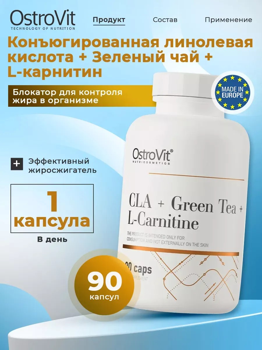Conjugated Linoleic Acid (CLA) Fat Burner + Green Tea + L-Carnitine, 90 Capsules from Ostrovit. CLA + Green Tea + L-Carnitine, 90 Capsules is a high-quality dietary supplement that is a source of conjugated linoleic acid, as well as green tea leaf extract and L-carnitine. Available in easy-to-swallow capsules, it is designed for physically active individuals and conscious consumers looking to supplement their daily diet with valuable ingredients. BENEFITS: Optimizes the ratio of lean to fatty tissue, reduces fat deposits in the waist, hips, and abdomen, contributes to weight control, helps block fat accumulation, and maintains the achieved weight. With this fat burner, you can achieve your desired weight and a beautiful, slim figure. Thanks to its comprehensive formula, it supports a healthy metabolism and promotes the development of lean muscle mass. This product is an ideal choice not only for women but also for men. It helps control appetite, promotes a feeling of satiety, and reduces the desire to eat unhealthy foods. Linoleic acid also effectively burns fat during exercise, which is especially important for gaining lean muscle mass. Combining food and sports nutrition is a key component of our weight loss program. CLA is a specially formulated fat blocker that controls body fat and helps achieve the desired slimming effect. It improves the effectiveness of diet and exercise, especially in the abdominal area. Cleansing the body and maintaining proper bowel and liver function are key aspects of health when using weight loss products. It serves as a powerful fat burner, thereby activating the body's calorie-burning system. This effect is achieved through a combination of the most professional fat-burning ingredients and controlled sports nutrition. This highly effective fat burner is the perfect product to help you lose weight and achieve a slimmer figure. It is designed with the specific needs of both women and men in mind, making it an ideal choice for everyone. The results of using this product are obvious: weight loss, health, beauty, and self-confidence. For even better results and rapid fat burning, we recommend combining it with a healthy diet and exercise. So, if you're looking for an effective weight loss product, the CLA + Green Tea + L-carnitine complex is a reliable assistant for strong people striving to achieve a slim figure and an ideal figure. DIRECTIONS: Take 1 serving (1 capsule), preferably before training. WARNING: Consult a physician before using dietary supplements if you are undergoing treatment for a medical condition, or if you are pregnant or breastfeeding. Store in a dry place at a temperature of 15-25°C, in a sealed container, out of the reach of small children.