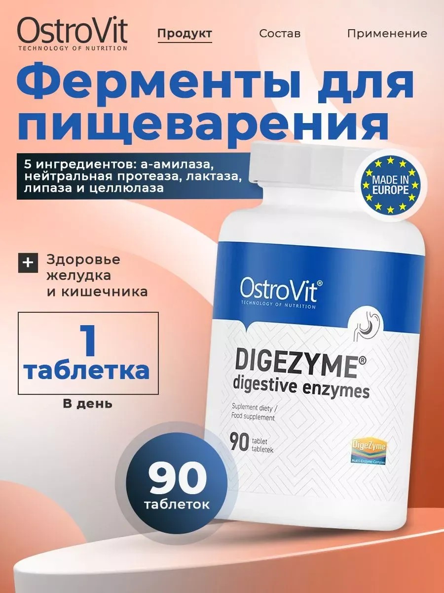 Пищеварительные ферменты 90 таблеток Ostrovit, Digezyme Digestive Enzymes 90 tabs - высококачественная биологически активная добавка, которая является источником мультиэнзимного комплекса DigeZyme, содержащего пять разных активных ингредиентов. Доступна в форме легко глотаемых таблеток, предназначена для людей, желающих обеспечить свой организм комплексом ценных ингредиентов. ПОЛЬЗА: Благодаря ему, вы сможете избавиться от дискомфорта и проблем, связанных с употреблением различных продуктов. Кроме этого DigeZyme известные также как энзимы, в значительной степени увеличивают биодоступность потребляемой пищи для полноценного усвоения важнейших нутриентов, витаминов, минералов. Принимая данный комплекс, вы забудете о изжоги, вздутии и диарее, болях в кишечнике, вызванных приемом молочных продуктов. Благодаря ему происходит очищение организма от токсинов и шлаков, что помогает в похудении и уменьшении веса, избавлении от отеков. Кроме этого, представленный комплекс крайне полезен для спортсменов и людей, ведущих активный образ жизни, так как помогает организму справиться с повышенным содержанием в рационе протеина и углеводов. В состав вошли: протеаза – расщепляют белки; амилаза – расщепляет крахмал; липаза – расщепляет жиры; целлюлаза – расщепляет пищевые волокна; лактаза – расщепляет молочный сахар. Они призваны стимулировать жкт и уменьшать запоры, что положительно сказывается на общем самочувствии и спокойствии системы пищеварения. Формула содержит пищеварительные ферменты, способствующие детокс чистке организма и поддержанию аппетита, поможет вам избавиться от прыщей на коже, укрепить ногти и волосы. Это натуральный препарат, который предназначен для взрослых мужчин и женщин. Набор таблеток содержат ультра мощные и эффективные средства, которые помогают комплексно поддерживать диету и правильное питание ПП. Этот витаминный комплекс разработан специально для укрепления силы иммунитета и восстановления здоровья. Превосходная формула внутри баночки, основа для поддержания роста энергии и бодрости в организме, необходимой для активной жизни и спортивной тренировочной формы. Товар подходит для сильных спортсменов, диетического и спортивного пит (спортпит). Мужские и женские профессиональные пищевые добавки, способны стать великолепным дополнением в рационе каждого человека, желающего получать максимум пользы от потребляемых продуктов и сохранять здоровое пищеварение. ПРИМЕНЕНИE: Принимайте 1 порцию (1 таблетку) в день. ПРЕДУПРЕЖДЕНИЕ: Проконсультируйтесь с врачом перед применением пищевых добавок, если вы проходите курс лечения от какого-либо заболевания. Продукт не следует использовать беременным женщинам и кормящим матерям. Хранить в плотно закрытой упаковке в сухом, защищенном от прямых солнечных лучей, месте, недоступном для детей, при температуре не более 15-25°C.