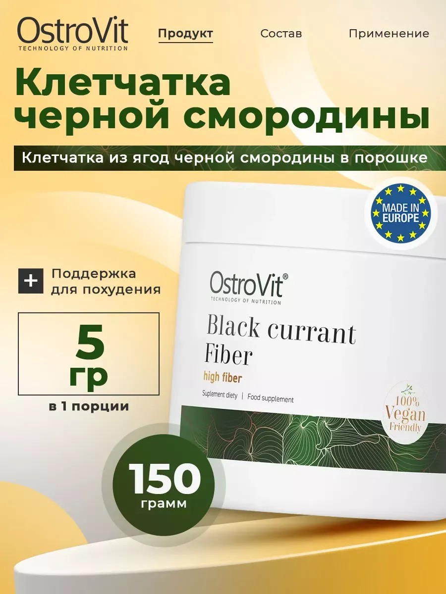Клетчатка черной смородины, банка 150 г Ostrovit, Black Currant Fiber VEGE 150 g – высококачественная пищевая добавка, обеспечивающая организм пищевыми волокнами. Это веганский препарат с простым составом, выпускаемый в порошкообразной форме, который можно использовать в качестве добавки к йогурту, овсянке или домашней выпечке. Его получают из сушенных выжимков ягоды черной смородины. Можно выделить две фракции пищевых волокон - растворимые и нерастворимые, которые обычно содержатся в таких продуктах, как овсяные хлопья, отруби, орехи или сухие бобовые. Её широко используют в медицине и диетологии для нормализации процессов пищеварения, снижения уровня сахара и вредного холестерина в крови, улучшения обмена веществ и поддержки функционирования желудочно-кишечного тракта ЖКТ. Улучшение работы и функций кишечника, улучшению упругости и эластичности кожи, детокс очищению эпидермиса от прыщей, воспалительных процессов и других дефектов. ПОЛЬЗА: подавляет чувство голода и даёт ощущение сытости, контролирует аппетит; помогает контролировать вес тела, способствует похудению и сжиганию жира; выводит из организма накопленные шлаки и токсины detox чистка; устраняет симптомы раздражённого кишечника, такие как запор или диарея; улучшает перистальтику кишечника, поддерживает регулярность опорожнения. Она находит свое место как в составе здорового завтрака, так и в качестве перекуса или добавки для создания полезных напитков и вкусных коктейлей. Свежие фрукты всегда привлекательны благодаря своей сочности и неповторимому вкусу. Несмотря на то, что клетчатка чёрной смородины имеет форму сушеных фруктов, она сохраняет все полезные свойства и насыщенный аромат свежих ягод. Это натуральный препарат в форме порошка, который предназначен для взрослых мужчин и женщин. Содержат ультра мощные и эффективные средства, которые помогают похудеть, комплексно поддерживать диету, правильное питание ПП и контроль баланса организма. Этот комплекс разработан специально для поддержания роста иммунитета, восстановления здоровья и красоты, у людей различных возрастных групп. Превосходная формула внутри баночки, основа для поддержания ultra balance и источник высокой энергии в организме, необходимой для активной жизни и спортивной тренировочной формы. Товар подходит для сильных спортсменов, диетического и спортивного пит (спортпит). Мужские и женские профессиональные пищевые добавки, помогут вам поддерживать баланс питательных веществ и увеличения энергии на целый день. Это настоящий подарок и незаменимый помощник для всех, кто стремится к здоровому образу жизни ЗОЖ, активному спорту и быстрому повышению имунитета. Приведите в норму свой образ жизни с клетчаткой черной смородины и наслаждайтесь всеми ее плюсами. ПРИМЕНЕНИE: Смешайте 1 мерную ложку клетчатки в 100-150 мл воды или сока. Выпейте дополнительный стакан воды. Продукт также можно добавлять в овсяную кашу, смузи или йогурт. Принимать 2 раза в день за 30 минут до еды.