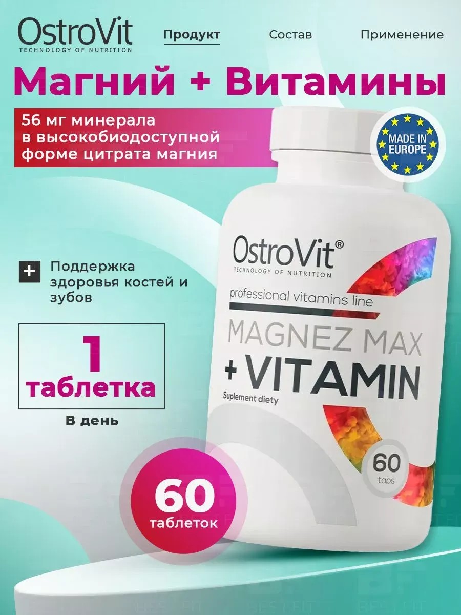 Магний Макс + Витамин 60 таблеток, Ostrovit, Magnez MAX + Vitamin 60 tabs - комплексная биологически активная добавка, которая содержит магний и ценные витамины. Это продукт, специально разработан для поддержания здоровья взрослых мужчин и женщин. Он поможет вам поддерживать укрепления иммунитета, улучшить работу сердца и нервной системы, а также поддерживать активный образ жизни. Магний положительно влияет на нервную и мышечную систему. Поддерживает здоровье костей и суставов, улучшает функцию сердца и сосудов, а также укрепляет имунитет. Также влияет на регуляцию аппетита и помогает контролировать вес, что будет особенно полезно для тех, кто стремится к похудению. Витамины группы В. Тиамин обеспечивает нормальное функционирование сердца, а рибофлавин - оптимальную работу нервной системы. В свою очередь, ниацин обеспечивает поддержку психологических функций, а пантотеновая кислота помогает поддерживать умственную деятельность на нормальном уровне, для мозга и памяти. Витамин B6 поддерживает нормальное функционирование иммунной системы, а фолат - правильный синтез аминокислот. Биотин способствует поддержанию здоровья кожи, волос и ногтей, а витамин В12 - снижению чувства усталости и утомления. Витамин C помогает поддерживать нормальную работу иммунной системы во время и после интенсивных физических нагрузок. Помимо этого, он обеспечивает нормальную выработку коллагена, необходимого для оптимального функционирования кровеносных сосудов, костей, хрящей и десен, а также зубов и кожи. Витамин Е способствует защите клеток от окислительного стресса. Эти мультивитаминный и минеральный комплекс является идеальным выбором для всех, кто заботится о своем здоровье и хочет получить все необходимые микроэлементы и витамины для организма. Этот комплексный препарат также является отличным подарком для ваших близких и друзей, которые заботятся о зож. Magnesium В6 и Д3 - это эффективный антистрессовый набор спортивных товаров, предназначенный для поддержки нервной системы. Этот продукт, содержащий магнезиум плюс витамин б6 и d3, а так же другие полезные минералы, имеет успокоительное и противовирусное действие, что особенно важно в современной жизни. Женские и мужские спорт витамины эффективны для предотвращения выпадения волос и против депрессии. Витаминный complex помогает увеличить массу и рост мышц, а также способствует восстановлению после тренировок. Надежный помощник для спортсменов, людей, которые заботятся о своем здоровье, а также для девушек, стремящихся сохранить свою форму и красоту. ПРИМЕНЕНИE: Принимайте 1 порцию (1 таблетку) в день через 15 минут после еды. ПРЕДУПРЕЖДЕНИЕ: Проконсультируйтесь с врачом перед применением пищевых добавок, если вы проходите курс лечения от какого-либо заболевания. Продукт не следует использовать детям, беременным женщинам и кормящим матерям. Хранить в плотно закрытой упаковке в сухом, защищенном от прямых солнечных лучей, месте, недоступном для детей, при температуре не более 15-25°C.