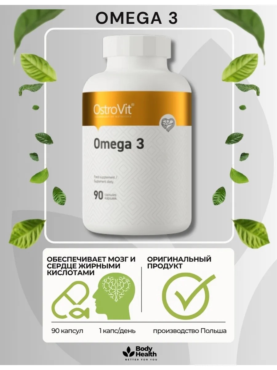 Омега 3, 90 мягких гелевых капсул, Ostrovit, Omega 3, 90 Capsules – высококачественная пищевая добавка на основе рыбьего жира как источника полиненасыщенных жирных кислот омега-3. Идеальный комплекс создан специально для поддержания здоровья и активного образа жизни ЗОЖ взрослых мужчин и женщин. Рыбий жир 1000 мг (mg) Omega3 содержит высокие концентрации омега3 жирных кислот. Одна порция продукта обеспечивает организм 180 мг эйкозапентаеновой кислоты (EPA) и 120 мг докозагексаеновой кислоты (DHA). Кислоты являются эффективными для поддержания здоровья сердца и сосудов, улучшения памяти и функций мозга, а также укрепления связок и суставов. Биодобавка помогает поддерживать нормальный холестерин, усиливает защиту от свободных радикалов, способствует снижению риска сердечно-сосудистых заболеваний и имеет полезные свойства для похудения и контроля веса. Как важный аспект для женского здоровья, vitamin Омега 3 благоприятно влияет на красоту и внешность женщин. Его регулярное употребление способствует улучшению состояния кожи, ногтей и зубов, для роста и против выпадения волос, делая их более здоровыми и красивыми. Это особенно важно для девушек, которые стремятся сохранить молодость и привлекательность. Омга 3 – натуральный продукт, полученный из рыбьего масла / жира fish oil высокого качества. Высокая концентрация омега три жирных кислот делает его одним из самых эффективных продуктов для поддержания здоровья сердца, мозга и суставов. Этот премиум витамин комплекс специально разработан для активных людей, занимающихся спортом или просто стремящихся к здоровому образу жизни. Омега 3 - незаменимое питательное вещество, которое помогает спортсменам повысить свою энергию и выносливость, улучшить восстановление после тренировок, а также снизить риск повреждений связок и суставов. Это эффективное дополнение к диетическому, правильному и спортивному питанию (спорт пит), необходимое для оптимального функционирования организма. Выводя все это в краткую формулу, амега 3 – натуральный, эффективный и безопасный способ поддерживать здоровье сердца, укреплять суставы и кости, улучшать память и мозговую активность, укреплять связки, улучшать состояние кожи, волос и ногтей и контролировать набор или потерю веса. Добавьте капсулы к своему режиму питания и наслаждайтесь всеми его преимуществами для своего здоровья и красоты. ПРИМЕНЕНИE: Принимайте 1 порцию (1 капсулу) в день, предпочтительно после еды. Запивайте соответствующим количеством воды. ПРЕДУПРЕЖДЕНИЕ: Хранить в недоступном для детей месте. Проконсультируйтесь с врачом перед применением пищевых добавок, если вы проходите курс лечения от какого-либо заболевания, а также в период беременности и лактации. Хранить при температуре 15-25 °C, закрытой упаковке, в сухом месте, беречь от прямых солнечных лучей.
