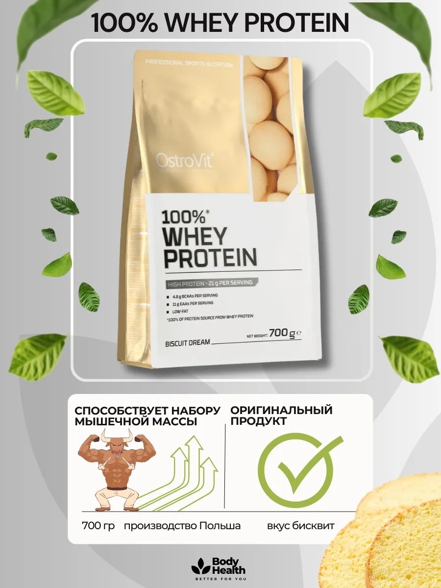 OstroVit 100% Whey Protein это добавка, которая является источником концентрата сывороточного белка, содержащего до 70% высококачественного белка. Препарат обеспечивает организм аминокислотами с разветвленной цепью BCAA, а также незаменимыми аминокислотами EAA. Это низкокалорийный продукт, доступный в порошкообразной форме с различными вкусами, созданный для спортсменов и людей, желающих дополнить свой ежедневный рацион ценным макроэлементом. Источник высококачественного белка -одна порция пищевой добавки обеспечивает организм 21 г белка, полученного из концентрата сывороточного протеина. Источник аминокислот с разветвленной цепью BCAA - в одной порции продукта содержится 4,8 г BCAA. Источник незаменимых аминокислот EAA - одна порция является источником 11 г незаменимых аминокислот. Низкое содержание жира - одна порция продукта обеспечивает организм 0,7 г жира. Без добавления сахара - пищевая добавка содержит низкокалорийный подсластитель сукралозу, что способствует снижению калорийности продукта. Различные варианты вкуса - Благодаря разнообразным вкусовым сочетаниям каждый найдет что-то для себя. 1 порция = 2,5 мерной ложки = 30 г. Эффективность - упаковка продукта содержит 23 порции. Удобная форма - препарат выпускается в порошкообразной форме, что обеспечивает удобный прием. OstroVit 100% Whey Protein - источник высококачественного белка Сывороточный протеин производится из молочной сыворотки, которая является побочным продуктом при производстве сыра. Это животный источник белка, который используется физически активными людьми, независимо от цели тренировок, уровня подготовки и опыта. Можно выделить три вида сывороточного белка - концентрат сывороточного белка (WPC), гидролизат сывороточного белка (WPH) и изолят сывороточного белка (WPI). В OstroVit 100% Whey Protein используется концентрат сывороточного белка из молока, который характеризуется высокой растворимостью, отличной усвояемостью и коротким временем всасывания, что положительно влияет на качество приема добавки.