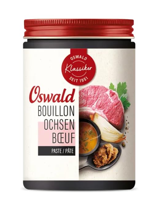 : Beef Meat Stock Paste, strong meat flavor, flavorful broth to drink, for refining rice, pasta, and potatoes. Ingredients: Iodized table salt, beef fat (with antioxidant (E320)), flavor enhancers (monosodium glutamate, E635), seasoning (soy), beef extract, onion powder, dried parsley, flavoring (soy), spices, yeast extract, sugar, rapeseed oil. Instructions: Dissolve 1 tablespoon (22 g) in 1 liter of boiling water and serve hot. See moreBringing the concentrated beef bouillon paste (special) to a boil releases a wonderful beef aroma. This clear, parsley-infused broth is essential as a base for all your soups, sauces, and dishes, and it perfectly complements any meal. You can add a strong yet subtle flavor to your dishes by using a small amount of this paste during cooking.Description du produit Bouillon de viande de bœuf en pâte, arôme puissant de viande, bouillon savoureux à boire, pour affiner le riz, les pâtes, les pommes de terre Ingrédients Sel de cuisine iodé Graisse de bœuf (avec antioxydant (E320)) exhausteurs de goût (glutamate de sodium, E635) condiment (soja) extrait de viande de bœuf oignons en poudre persil séché arôme (soja) épices extrait de levure sucre huile de colza P.when('A').execute(function(A) { A.on('a:expander:toggle_description:toggle:collapse', function(data) { window.scroll(0, data.expander. expander[0].offsetTop-100) }) }) Mode d'emploi Dissoudre 1 cuillère à soupe (22 g) dans 1 litre d'eau bouillante et servir chaud. Voir plusEn portant la pâte concentrée de bouillon de bœuf (spécial) à ébullition, elle dégage une merveilleuse odeur de bœuf. Ce bouillon clair au persil est indispensable comme base pour toutes vos soupes, sauces et vos plats, il complète parfaitement chaque plat. Vous pouvez donner à vos plats une saveur forte et subtile en utilisant un peu de cette pâte pour la cuisson.Oswald Bouillon de bœuf spécial (à la manière suisse), 1 kg - Pâte concentrée de bouillon de viande, arôme fort de bœuf, pour affiner le riz, les plats, les pommes de terre