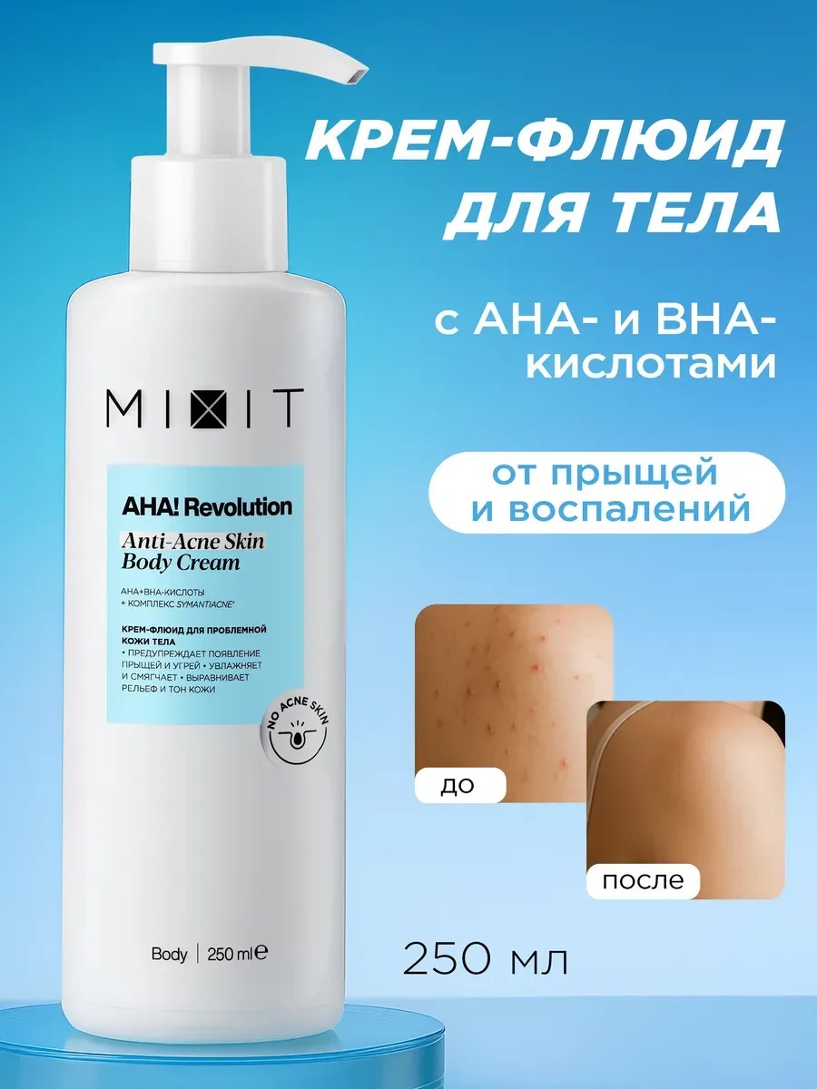 МИКСИТ Увлажняющий парфюмированный крем для тела AHA! Revolution Body Cream – мощное средство ухода за кожей тела, рук и ног против прыщей и пигментации. Благодаря кислотам натуральный осветляющий крем сглаживает следы постакне и пигментных пятен. Он универсален, поэтому подходит для мужчин и женщин, а также для девочек с 14 лет. Снимает воспалительные процессы на коже и возвращает ей жизненную энергию и упругость, способствует сокращению видимость поверхностных морщин и рубцов. Кислотный комплекс Sym Anti Acne + снимает раздражения и сухость, снижает риск появления акне и высыпаний на спине, оказывая легкое отбеливание. Пантенол обеспечивает интенсивное увлажнение. Отбеливающий и омолаживающий ароматизированный флюид для осветления и выравнивания тона с запахом предупреждает появление воспалений и угрей, нормализует работу сальных желез, увлажняет и смягчает. Премиум питательный отбеливатель анти акне имеет нежный парфюмерный аромат. Эффект после применения. Антиакне эффект, идеальная кожа без чистки. Рекомендуем использовать для зоны груди. Маленький мини подарочный размер. Профессиональная возрастная уходовая косметика красоты premium для женской, мужской, подростковой, очень сухой, жирной, комбинированной кожи. Подарок для девушки и него.