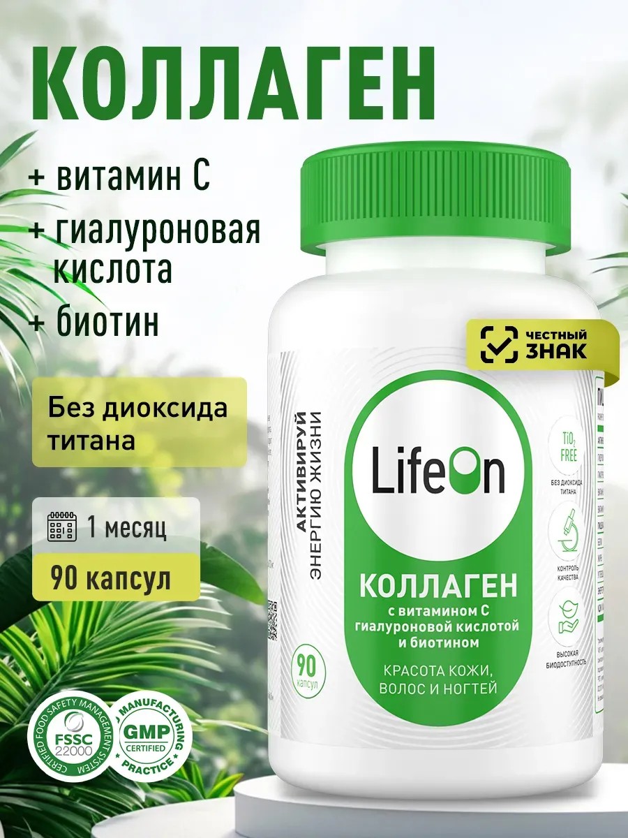 Коллаген в капсулах с Гиалуроновой кислотой, Биотином и Витамином C от LifeOn — комплекс витаминов для женщин с накопительным эффектом, которые помогут сохранить красоту кожи, волос и ногтей. В одной порции (3 капсулы) содержится: гидролизованный говяжий коллаген (1080 мг) гиалуроновая кислота (60 мг) витамин С (90 мг) биотин (витамин В7) (150 мкг) При регулярном приеме БАД в течение двух месяцев значительно улучшится состояние кожи, уйдет сухость, восстановится эластичность, она станет мягкой и бархатистой. Волосы перестанут выпадать, будут сильными и блестящими, ускорится рост новых волосков. Ногти окрепнут и перестанут ломаться. компонентов комплекса: Collagen представлен в самой легкоусвояемой форме пептидов, которые максимально усваиваются в организме и быстро включаются в работу. Таким образом коллаген поддерживает здоровье опорно-двигательного аппарата, улучшает подвижность суставов и эластичность связок. Биотин (витамин в7) называют витамином для волос. Он активизирует их рост, уменьшает выпадение, восстанавливает структуру по всей длине. Гиалуроновая кислота направлена на поддержание уровня влаги в межклеточном пространстве, улучшает тургор кожи, сокращает мелкие морщинки и замедляет процессы старения. Витамин С способствует усвоению коллагена. Благодаря его присутствию в комплексе вы точно заметите эффект от приема БАД. В одной упаковке (90 капсул) содержится 30 порций. Рекомендуется принимать по 3 капсулы 1 раз в день за 30 минут до завтрака. Продолжительность курса — 1 месяц, при необходимости прием можно повторить. Активируй энергию жизни — живи на полную c LifeOn. Сделано в России по международным стандартам GMP, ISO. Свидетельство о государственной регистрации AM.01.08.01.003.R.000051.04.23