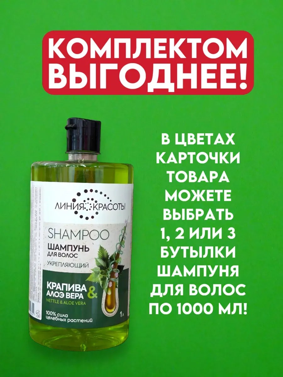 Набор уходового укрепляющего шампуня для всей семьи представлен комплектами из 1/2/3 флаконов по 1000 мл (1л). Выбирайте подходящее количество в цветах данной карточки товара! Подарите своим волосам заботу, которую они заслуживают, с укрепляющим шампунем «Линия Красоты». Этот женский шампунь с новой усиленной формулой не только качественно очищает волосы и кожу головы, но и делает их сильнее и визуально гуще. Преимущества-это натуральные компоненты: Формула 100% сила целебных растений, то есть шампунь состоит из компонентов натурального происхождения, что помогает предотвратить выпадение волос из-за ломкости, питает и защищает их от повреждений. Эффективное восстановление: шампунь для волос преображает ваши локоны, обеспечивая ухаживающее действие. Экстракт листьев крапивы, богатый витаминами, укрепляет корни волос и стимулирует их рост. Подходит для всех типов волос: Шампунь идеально подходит как для женщин, так и для мужчин, а также для всех типов волос — от жирных до окрашенных. Он бережно очищает и придает здоровый вид без пересушивания. Большой объем: Удобная упаковка объемом 1000 мл обеспечит вам длительное наслаждение естественно красивыми и крепкими волосами после каждого мытья. Профессиональный уход: Разработан с учетом самых высоких стандартов качества, шампунь эффективно удаляет загрязнения и остатки стайлинга, образуя защитную пленку на поверхности волос. Способ применения: Нанесите небольшое количество шампуня на влажные волосы, вспеньте и смойте. Для максимального эффекта используйте в комплексе с бальзамом для волос. Выбирая укрепляющий шампунь «Линия Красоты», вы делаете шаг к здоровью ваших волос и заботитесь о своей красоте с использованием натуральных ингредиентов. Позаботьтесь о своих локонах уже сегодня — они скажут вам спасибо!'
