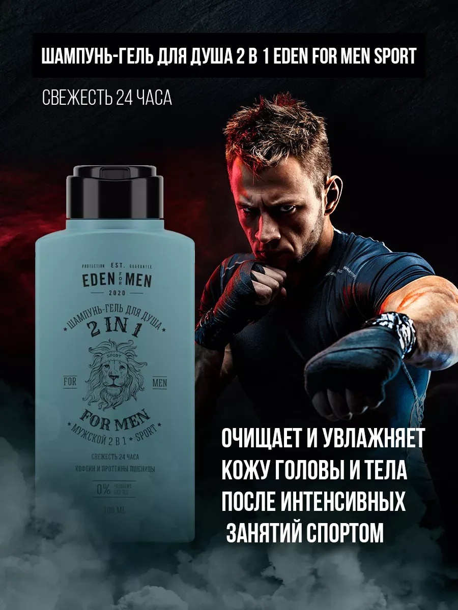 EDEN FOR MEN 2-in-1 Shampoo and Shower Gel, Travel Size 100 ml, lathers well, thoroughly cleanses skin, and gently conditions hair. This 2-in-1 shampoo gel effectively cleanses and moisturizes the scalp and body. After use, the body feels clean and hair is silky. Biolin, a natural plant prebiotic, restores normal pH levels and strengthens the skin's protective functions. Wheat protein hydrolysate protects skin and hair from harmful environmental influences. Menthol and caffeine tone, refresh, and have an invigorating effect. Created specifically for hair and body care. The fresh, masculine aroma invigorates and maintains a feeling of freshness for 24 hours. Suitable for daily use. Suitable for frequent use. A wonderful gift for dad, friend, husband, loved one, grandfather - for any holiday: New Year, birthday, February 23rd! Shampoo for men, shower gel for men. Universal hair and body wash, gift for men. INGREDIENTS: Aqua, Sodium Laureth Sulfate, Glycerin, Cocamide DEA, Cocamidopropyl Betaine, Coco Glucoside, Sodium Chloride, Phenoxyethanol, Ethylhexylglycerin, Parfum, Inulin (And) Alpha-Glucan Oligosaccharide, Caffeine (Caffeine), Citric Acid, Green Tea Extract (Green Tea Extract), Hydrolyzed Wheat Protein (Hydrolyzed Wheat Protein), Hydroxypropyl Guar (And) Hydroxypropyltrimonium Chloride, Menthol (Menthol), Linalool.