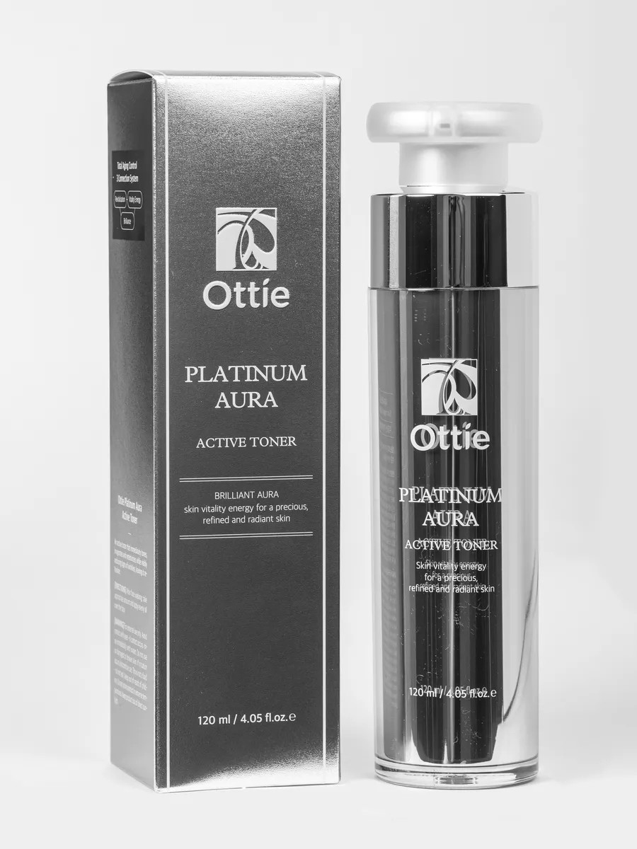 Ottie Platinum Aura Active Toner, a rejuvenating toner with platinum, caviar, and kakadu plum extract for mature skin, restores hydrolipid balance, moisturizes, and stimulates metabolic processes in epidermal cells. This premium toner helps smooth fine wrinkles, improves skin tone, and helps combat pigmentation and age spots. It strengthens the protective barrier, tones, and leaves skin healthy and radiant.