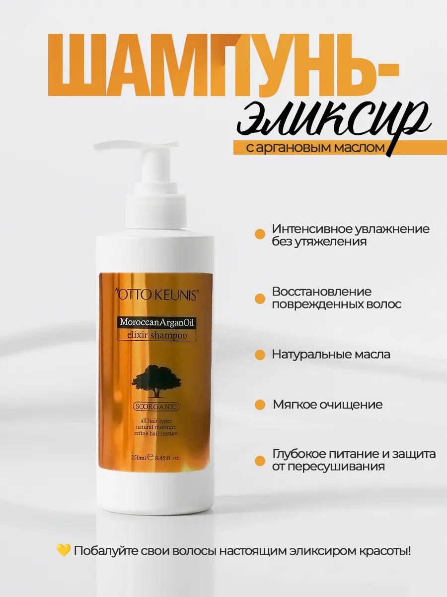 Шампунь Otto Keunis SoOrganic Elixir обогащен аргановым маслом, которое широко используется для ухода за волосами и ценится во всем мире за свои питательные свойства. Благодаря этому уникальному компоненту, шампунь помогает: