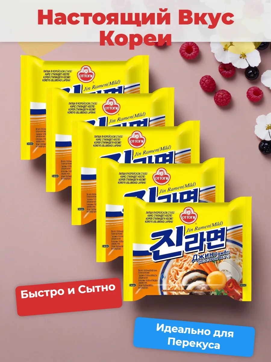 Jin Ramen Mild instant noodles depart from the traditional spiciness of Korean cuisine, boasting a mild flavor and a spicy, meaty aroma. 5 pieces per package. Product ingredients: Noodles: wheat flour, modified starch, palm oil, wheat fiber, refined salt, vitamin B2, citric acid, flavored green tea oil. Base: salt, sugar, beef bone seasoning, soy sauce powder, garlic concentrate, cornstarch, dried onions, carrots, shiitake mushrooms, and seaweed. Directions: Pour 500 ml of water into a saucepan, bring to a boil, and add the bag of vegetables, stirring thoroughly. Add the noodles and spices from the second bag to the vegetable broth. Add one egg, if desired, then cover the noodles with a lid for a few minutes. Delicious and aromatic ramen is ready.