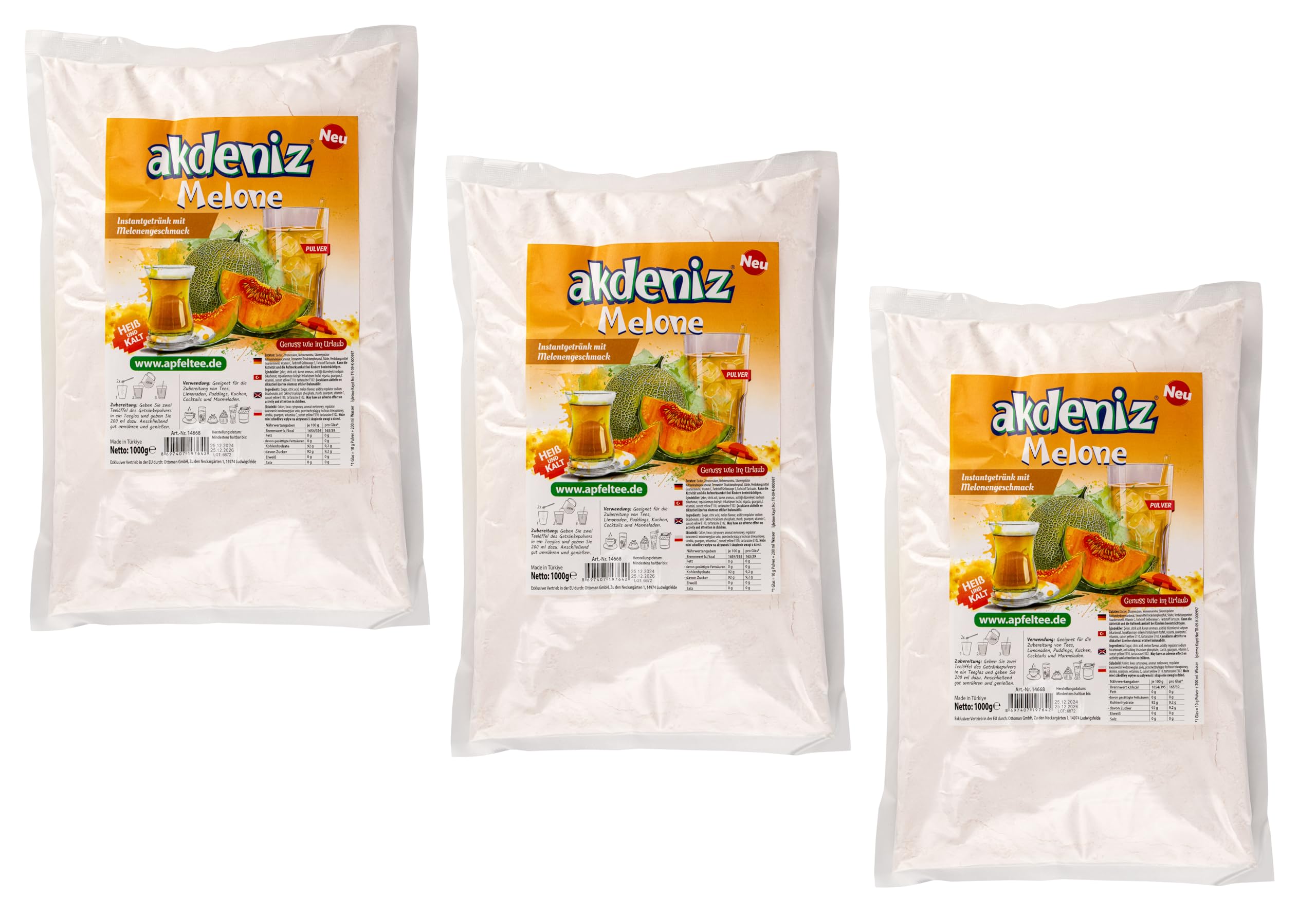 The mango drink has an indescribable taste. This is reminiscent of the Orient and the fairy tales from 1001 nights. The slightly sweet aroma is very refreshing, especially in the warm summer months. However, it can also be enjoyed in any other season. Served warm, it is a delicious alternative for refreshment. You can prepare this tea with cold or warm water without much effort. The tea powder has many uses, for example for the production of fruit juices, cakes and puddings. INGREDIENTS sugar, acidulant citric acid, flavouring, separating agent (tricalcium phosphate), vitamin C, colorants (green--S, ammon sulphite - sugar color) INSTRUCTIONS FOR USE Dissolve in hot, warm or cold water by stirring. One crocheted teaspoon per 100 ml See more3 x 1 kg Akdeniz Melone instant drank met meloensmaak in poedervorm De mangodrank heeft een onbeschrijfelijke smaak. Deze doet denken aan het Orient en de sprookjes uit 1001 nacht. Het licht zoete aroma werkt vooral in de warme zomermaanden zeer verfrissend. Hij kan echter ook in elk ander seizoen worden genoten. Warm gedronken is het een heerlijk alternatief voor je verfrissing. Zonder veel moeite kun je deze thee met koud of warm water bereiden. Het theepoeder is veelzijdig bruikbaar, bijvoorbeeld voor de productie van vruchtensappels, cake en pudding. INGREDIËNTEN suiker, zuurmiddel citroenzuur, aroma, scheidingsmiddel (tricalciumfosfaat), vitamine C, kleurstoffen (groen--S, ammonsulfiet - suikerkulor) GEBRUIKSAANWIJZING Oplossen in warm, warm of koud water door roeren. Per 100 ml een gehaakte theelepel Meer bekijken