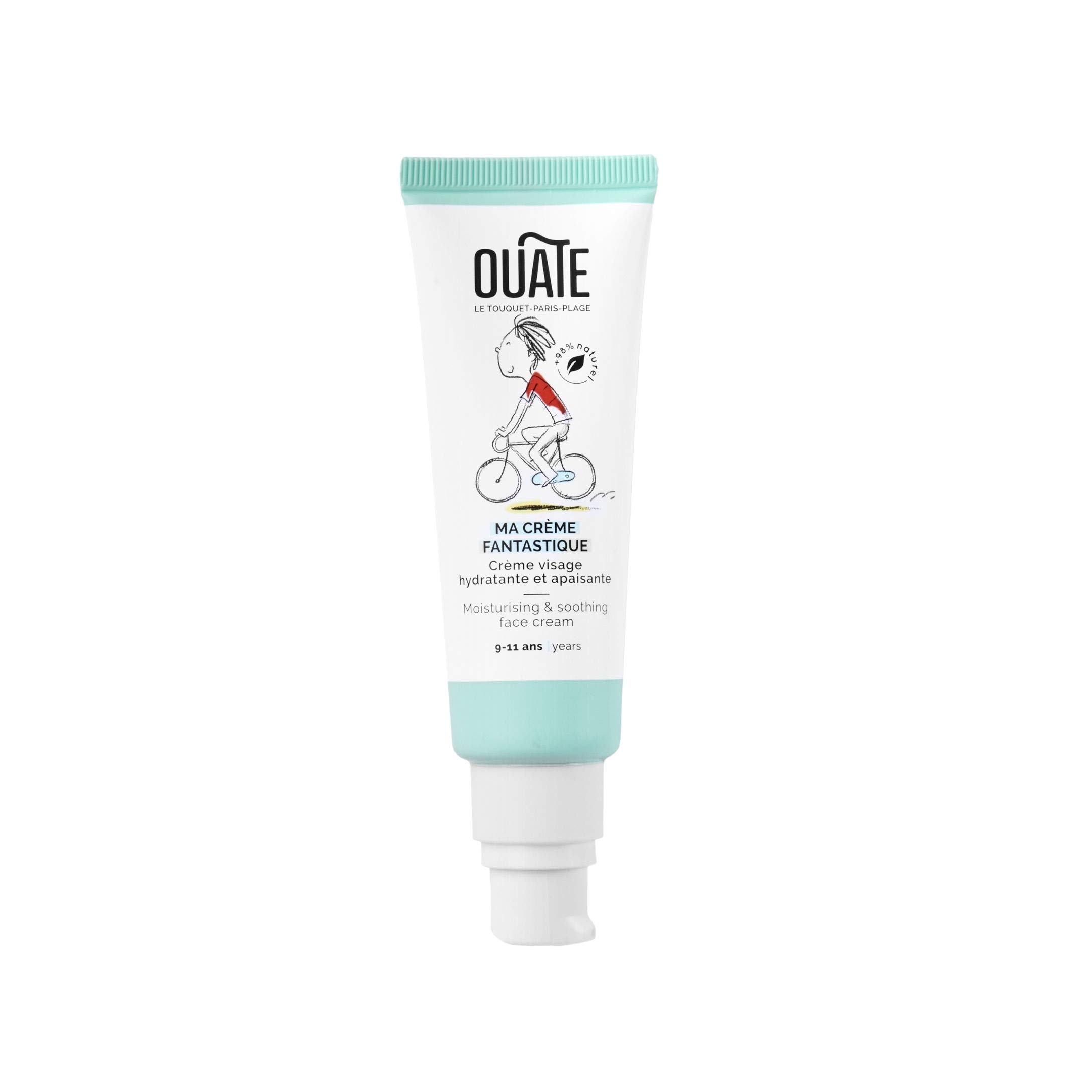 COSMETIC RANGE FOR CHILDREN FROM 4 TO 11 YEARS OLD: Dedicated to children who are no longer babies, but not yet teenagers, OUATE skincare products offer healthy and natural formulas to pamper the still fragile skin of the youngest. SAFE, HEALTHY AND NATURAL: Tested under dermatological and pediatric control, Ma Crème Fantastique is a vegan, Made in France skincare product, formulated from 98 ingredients of natural origin and allergen-free. DIRECTIONS FOR USE: After cleansing and drying the face, apply a small amount of Ma Crème Fantastique to the skin, morning and evening. THE LITTLE EXTRA PRACTICAL AND ECO-FRIENDLY: Easy to use on its own, the tube of Ma Crème Fantastique is specially developed for the little hands of children aged 9 11. Once empty, it can be recycled. MOISTURIZING CREAM FOR BOYS AGES 9 TO 11: My Fantastic Cream is a wonderfully scented, gentle cream with a natural formula that moisturizes and soothes the delicate facial skin of boys ages 9 to 11.GAMME COSMÉTIQUE POUR ENFANTS DE 4 À 11 ANS : Dédiés aux enfants qui ne sont plus des bébés, mais pas encore des ados, les soins OUATE proposent des formules saines et naturelles pour chouchouter la peau encore fragile des plus jeunes. SÛRE, SAINE ET NATURELLE : Testée sous contrôle dermatologique et pédiatrique, Ma Crème Fantastique est un soin vegan, Made in France, formulé à partir de 98 d'ingrédients d'origine naturelle et sans allergènes. CONSEILS D'UTILISATION : Après avoir nettoyé et séché le visage, appliquer une noisette de Ma Crème Fantastique sur la peau, matin et soir. LE PETIT PLUS PRATIQUE ET ÉCOLO : Facile à utiliser tout seul, le tube de Ma Crème Fantastique est spécialement développé pour les petites mains des enfants de 9 11 ans. Une fois vide, il peut être recyclé. CRÈME HYDRATANTE POUR GARÇONS DE 9 À 11 ANS : Ma Crème Fantastique est une crème toute douce au parfum merveilleux, dont la formule naturelle hydrate et apaise la peau délicate du visage des garçons de 9 à 11 ans.