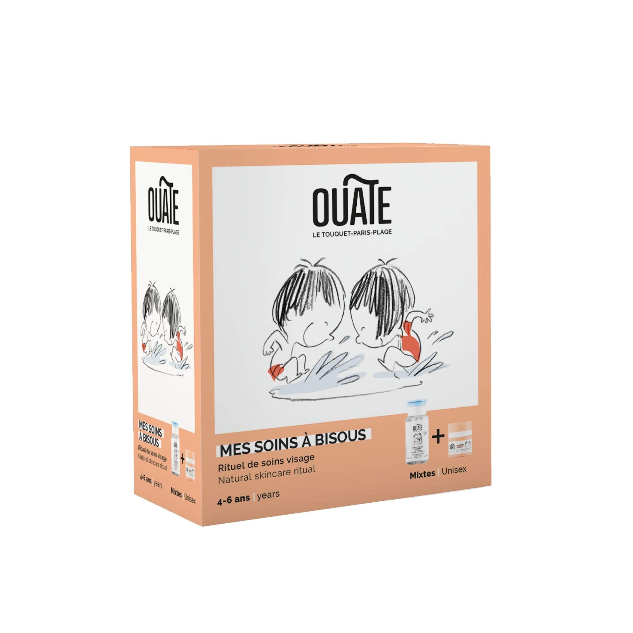 COSMETIC RANGE FOR CHILDREN FROM 4 TO 11 YEARS OLD: Dedicated to children who are no longer babies, but not yet teenagers, OUATE skincare products offer healthy and natural formulas to pamper the still fragile skin of the youngest. SAFE, HEALTHY AND NATURAL PRODUCTS: Tested under dermatological, pediatric and ophthalmological control, the skincare products in this set are vegan, Made in France and formulated from at least 95 ingredients of natural origin and allergen-free. DIRECTIONS FOR USE: For a complete daily facial routine, cleanse the skin with Mon Nettoyant Douceur, then apply a dose of Ma Potion à Bisous to a dry face, morning and evening. THE LITTLE EXTRA PRACTICAL AND FUN: Easy to use on your own from 4 years old, the Ma Potion à Bisous moisturizing treatment has a smart dispenser. Just press the buzzer, like in the games, to get the right dose of product!. CHILDREN'S SKINCARE SET FOR 4 TO 6 YEARS OLD: Ideal as a gift for children aged 4 to 6, this discovery set contains the essential OUATE skincare products to cleanse, moisturize and protect the delicate skin on their face.GAMME COSMÉTIQUE POUR ENFANTS DE 4 À 11 ANS : Dédiés aux enfants qui ne sont plus des bébés, mais pas encore des ados, les soins OUATE proposent des formules saines et naturelles pour chouchouter la peau encore fragile des plus jeunes. PRODUITS SÛRS, SAINS ET NATURELS : Testés sous contrôle dermatologique, pédiatrique et ophtalmologique, les soins de ce coffret sont vegan, Made in France et formulés à partir d'au moins 95 d'ingrédients d'origine naturelle et sans allergènes. CONSEILS D'UTILISATION : Pour une routine visage complète au quotidien, nettoyez la peau avec Mon Nettoyant Douceur, puis appliquez une dose de Ma Potion à Bisous sur le visage sec, matin et soir. LE PETIT PLUS PRATIQUE ET RIGOLO : Facile à utiliser tout seul dès 4 ans, le soin hydratant Ma Potion à Bisous possède un doseur intelligent. Il suffit d'appuyer sur le pot-buzzer, comme dans les jeux pour obtenir la juste dose de produit !. COFFRET DE SOINS POUR ENFANTS DE 4 À 6 ANS : Idéal à offrir en cadeau aux enfants de 4 à 6 ans, ce coffret découverte contient l'essentiel des soins OUATE pour nettoyer, hydrater et protéger la peau délicate de leur visage.