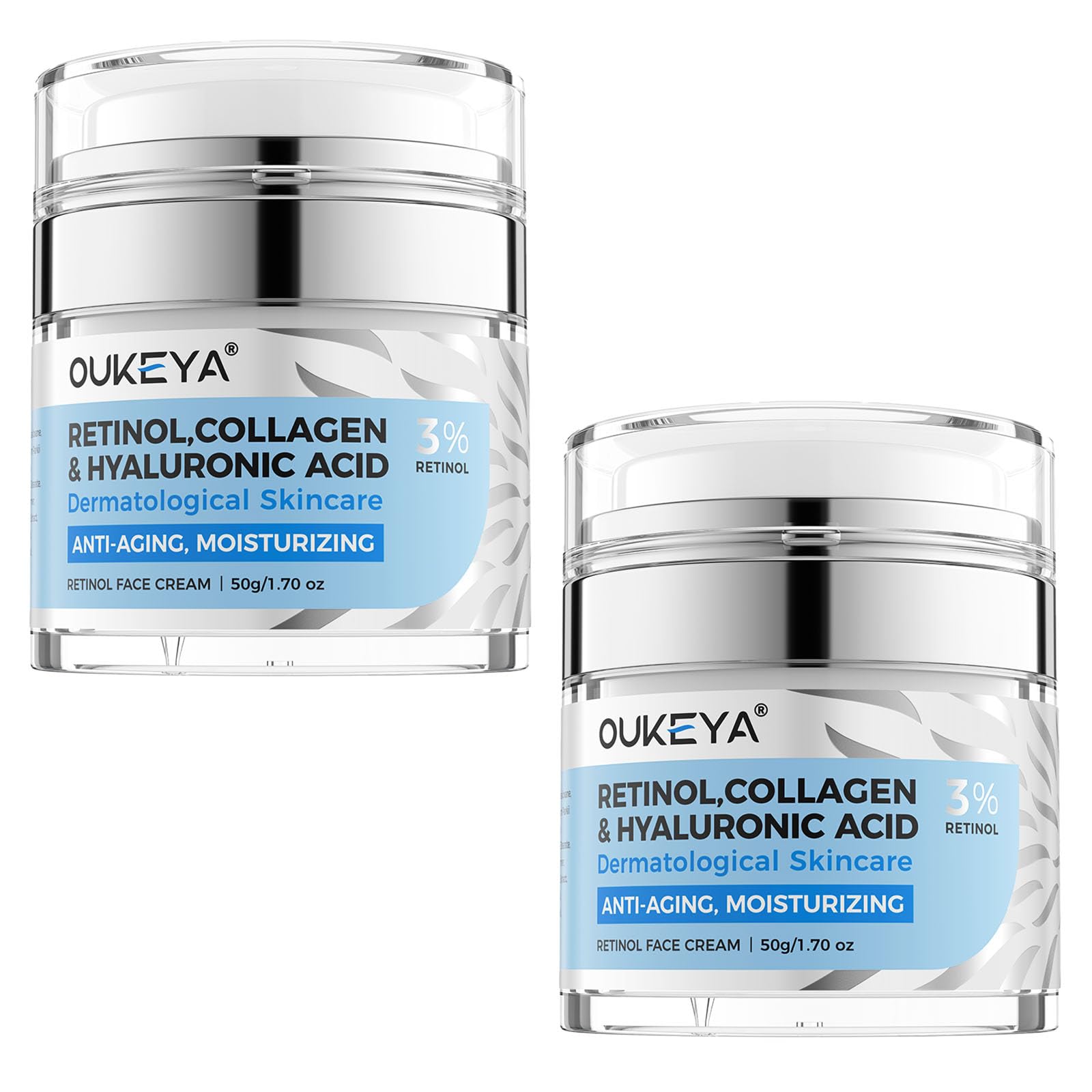 Product Details The Science Behind the Formula Our 3 Retinol3D Complex utilizes three key technologies: Timed Release: Retinol is protected by a phospholipid membrane and activated only in the targeted skin layer. pH Buffer System: Stabilizes niacinamide to optimize pore refinement. Hyaluronic Acid Oligosaccharides: 3 molecular sizes (0.5 -1 -5 ) to hydrate from the epidermis to the dermis. Visible Results in 4 Steps One Week: Hyaluronic acid for immediate skin firming One Week: More even skin tone thanks to niacinamide One Week: Visible wrinkle reduction One Week: Long-term protective matrix for collagen production. High-tech ingredients Oat extract: soothes sensitive skin (72-hour patch test) Acetyl Hexapeptide 8: botulinum toxin effect without injections Tocotrienols (vitamin E): antioxidant protection 50 times greater than that of ordinary vitamin E. Sustainability thanks to a smart formulation Biodegradable polymers instead of microplastics Vegan squalane derived from sugar cane, not shark liver Recyclable glass bottle with a 360 dropper for precise dispensing Professional use advice "To start, use twice a week in the evening, along with your favorite cream. After two weeks, switch to daily use. Always use SPF 30 sunscreen during the day!" SAFETY WARNING For external use only. Avoid contact with eyes, eyelids, and lips. In case of contact with eyes, rinse immediately and thoroughly with water. Gradual start. If you are using retinol for the first time, begin by applying the cream every three nights to allow your skin to adjust. Then gradually increase the frequency if needed. Use at night. Retinol degrades in sunlight, so always apply this cream as part of your evening routine. Sun protection is absolutely essential. Retinol can make skin more sensitive to UV rays. During the day, you should always use a broad-spectrum sunscreen with a high SPF to protect your skin. Avoid simultaneous use with certain other products. Do not use this cream at the same time as products containing acids (such as AHAs BHAs) or benzoyl peroxide, unless advised by a dermatologist, as this may increase the risk of irritation. Perform a patch test. Before applying the cream to your entire face, test it on a small, discreet area of skin (such as the inside of your arm) to check for any sensitivities or allergic reactions.[Use] All pumps function perfectly. For first-time use, press repeatedly if necessary until the cream reaches the top, then dispense the desired amount from the center. Do not unscrew the cap: the inner cap protects against germs. Avoid simultaneous use with irritating ingredients (e.g., salicylic acid fruit acids) to prevent skin irritation. Prevents skin aging, suitable for all skin types and age groups. [24-Hour Day Night Anti-Wrinkle Care] Hydrates and firms in the morning, supports skin regeneration in the evening. For sensitive skin, perform a patch test beforehand. Daytime use: combine with SPF 30 sunscreen. Clinically proven ingredients deeply nourish, improve skin elasticity and renewal. The lightweight texture absorbs quickly without residue, prevents wrinkles, and strengthens the skin barrier. Non-comedogenic, suitable for face and neck. Deep Hydration Protective Barrier Hyaluronic acid and plant extracts work synergistically to retain moisture, strengthen the skin barrier, accelerate cell metabolism, restore lost elasticity, and provide all-day hydration. Lightweight, fast-absorbing texture with no greasy residue. Non-comedogenic formula that won't clog pores, provides long-lasting hydration, and leaves skin smooth, soft, and silky-smooth. Lightens Dark Spots The retinol cream is also formulated with niacinamide and hyaluronic acid, which help regulate sebum production, reduce shine, improve acne and breakouts, inhibit melanin production, lighten discolorations, and give a brighter complexion. Hyaluronic acid also promotes wound healing, has antibacterial and anti-inflammatory effects, and effectively eliminates skin inflammation. A More Effective Anti-Aging Solution Unlike 2.5 retinol creams on the market, we use 3 retinol and add 5 niacinamide and 5 hyaluronic acid. This can more effectively promote skin cell renewal, stimulate collagen and elastin production, increase skin elasticity, reduce the cause of wrinkles, and improve existing wrinkles. It also has an antioxidant effect, resulting in younger-looking skin.OUKEYA Creme Retinol Visage - 3 Rétinol 5 Niacinamide Acide Hyaluronique - Anti Ride, Anti Age, Blanchir, Hydrater, Contrôle De l'Huile, 2 x 50gDESCRIPTION DU PRODUIT DESCRIPTION DU PRODUIT Détails du produit La science derrière la formule Notre complexe 3 Retinol3D utilise trois technologies clés : Libération programmée : le rétinol est protégé par une membrane phospholipidique et activé uniquement au niveau de la couche cutanée ciblée. Système tampon de pH : stabilise le niacinamide pour optimiser l'affinement des pores. Oligosaccharides d'acide hyaluronique : 3 tailles moléculaires (0,5 -1 -5 ) pour hydrater de l'épiderme au derme. Résultats visibles en 4 étapes Une semaine : acide hyaluronique pour un raffermissement immédiat de la peau Une semaine : un teint plus uniforme grâce à la Niacinamide Une semaine : réduction visible des rides Une semaine : matrice protectrice à long terme pour la production de collagène. Ingrédients de haute technicité Extrait d'avoine : apaise les peaux sensibles (test épicutané de 72 heures) Acétyl Hexapeptide 8 : effet de la toxine botulique sans injections Tocotriénols (vitamine E) : protection antioxydante 50 fois supérieure à celle de la vitamine E ordinaire. Durabilité grâce à une formulation intelligente Polymères biodégradables au lieu de microplastiques Squalane végétalien issu de la canne à sucre, et non du foie de requin Flacon en verre recyclable avec pipette à 360 pour un dosage précis Conseils d'utilisation professionnelle « Pour commencer, utiliser deux fois par semaine le soir, 