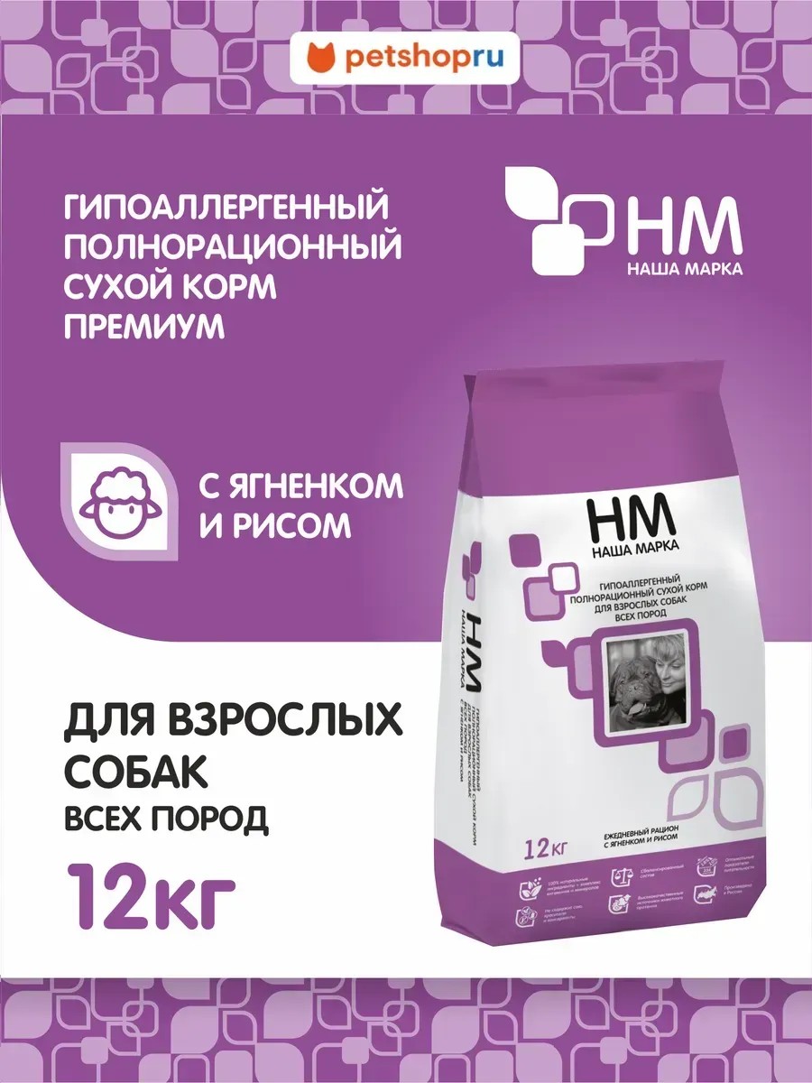 Dear customers! Please note that this product will be temporarily shipped in white, unbranded bags. "Nasha Marka" dry hypoallergenic dog food for all breeds offers an excellent combination of lamb and rice flavor with beneficial vitamins and essential microelements to help your dog lead an active and healthy life. A source of linoleic acid and adequate levels of B vitamins ensure a healthy appearance, shiny coat, and healthy skin. The appropriate energy value of the food helps maintain body weight and prevents obesity. Optimal fiber content promotes proper gastrointestinal function.