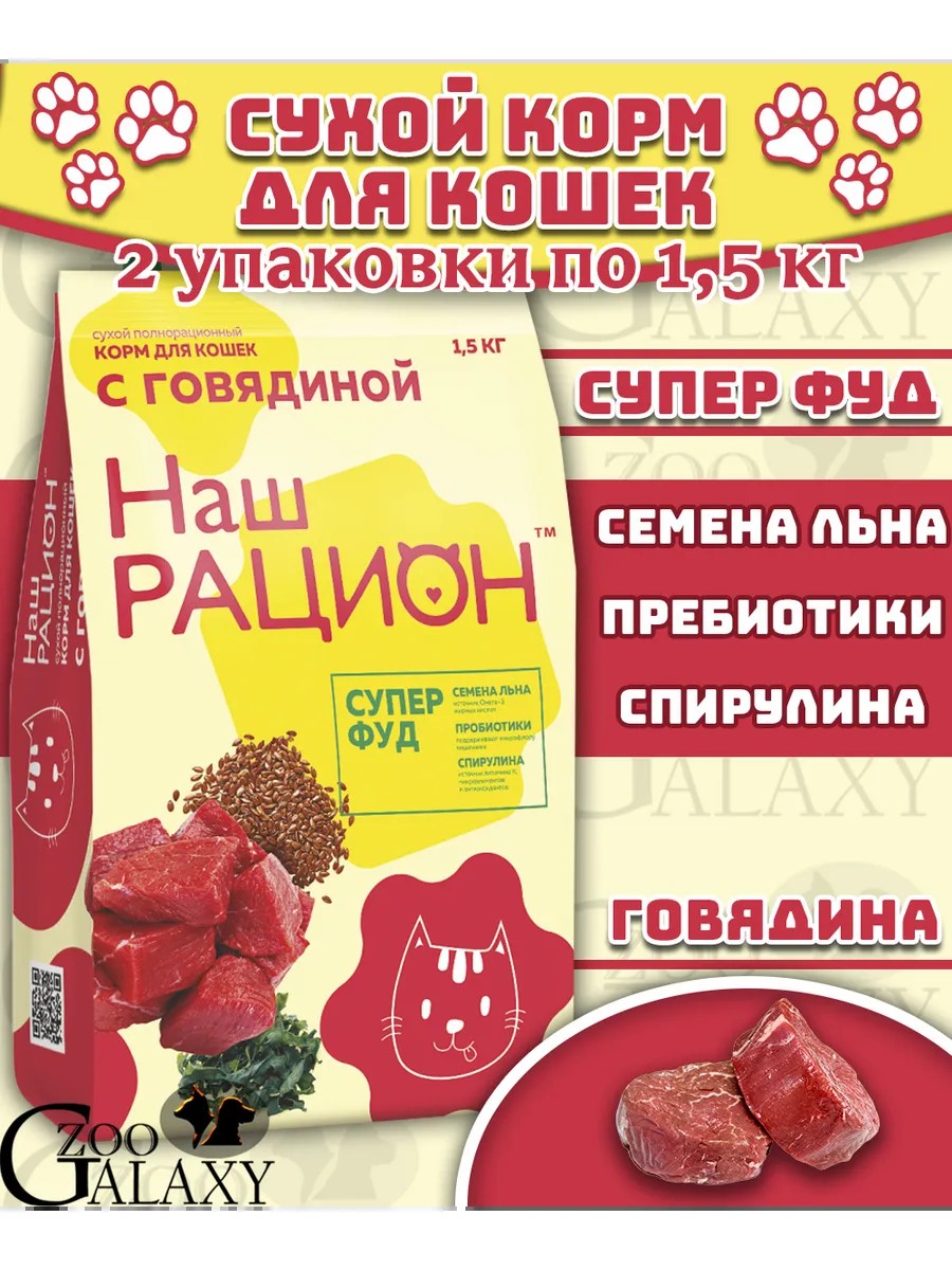 Сухой корм для кошек с говядиной 2х1,5 кг