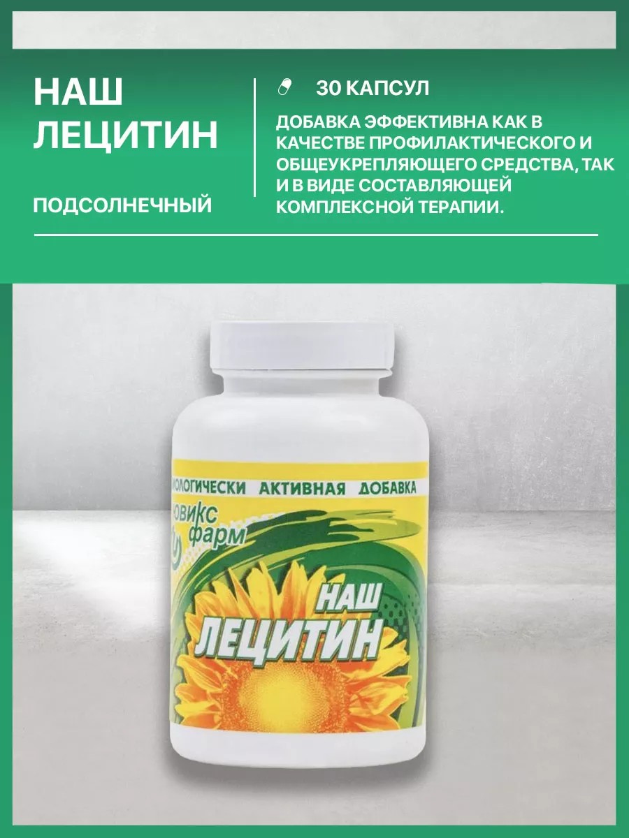"Наш лецитин" производится по оригинальной запатентованной технологии из семян подсолнечника, выращенного в экологически чистых условиях Краснодарского края. Препарат отличается высокой степенью очистки, экологически и иммунологически безопасен. По своим качественным характеристикам не уступает многим отечественным и зарубежным аналогам. Из лецитина состоит мембрана клеток организма человека, 1/3 мозговых изолирующих и защитных тканей, окружающих головной и спинной мозг, тысячи километров нервных волокон. Лецитин необходим организму как строительный материал для обновления и "ремонта" поврежденных клеток. - это основное транспортное средство для доставки питательных веществ, витаминов и лекарств к клеткам. При дефиците лецитина снижается эффективность воздействия большинства лекарственных препаратов. - лецитин также является мощным антиоксидантом, предупреждает образование высокотоксичных свободных радикалов в организме. Универсальность лецитина проявляется в том, что он предупреждает заболевания и способствует лечению сердечно-сосудистых заболеваний (атеросклероз, ишемия, инфаркт), гастроэнтерологических заболеваний (цирроз, гепатит, желчекаменная болезнь), заболеваний периферической нервной системы (остеохондроз, радикулит, псориаз, дерматит и пр.). Лецитин растительного происхождения, входящий в состав биологической добавки, при регулярном приеме существенно улучшает общее состояние организма и самочувствие. Это ценное вещество участвует во многих жизненно важных процессах и является незаменимым для поддержания нормального функционирования тканей, органов, систем нашего тела. Человеческий организм самостоятельно синтезирует лецитин, но в весьма небольших количествах, недостаточных для поддержания нормальной жизнедеятельности. А любой сбой приводит к существенному снижению объемов вырабатываемого вещества, дополнить которое за счет традиционного рациона невозможно.