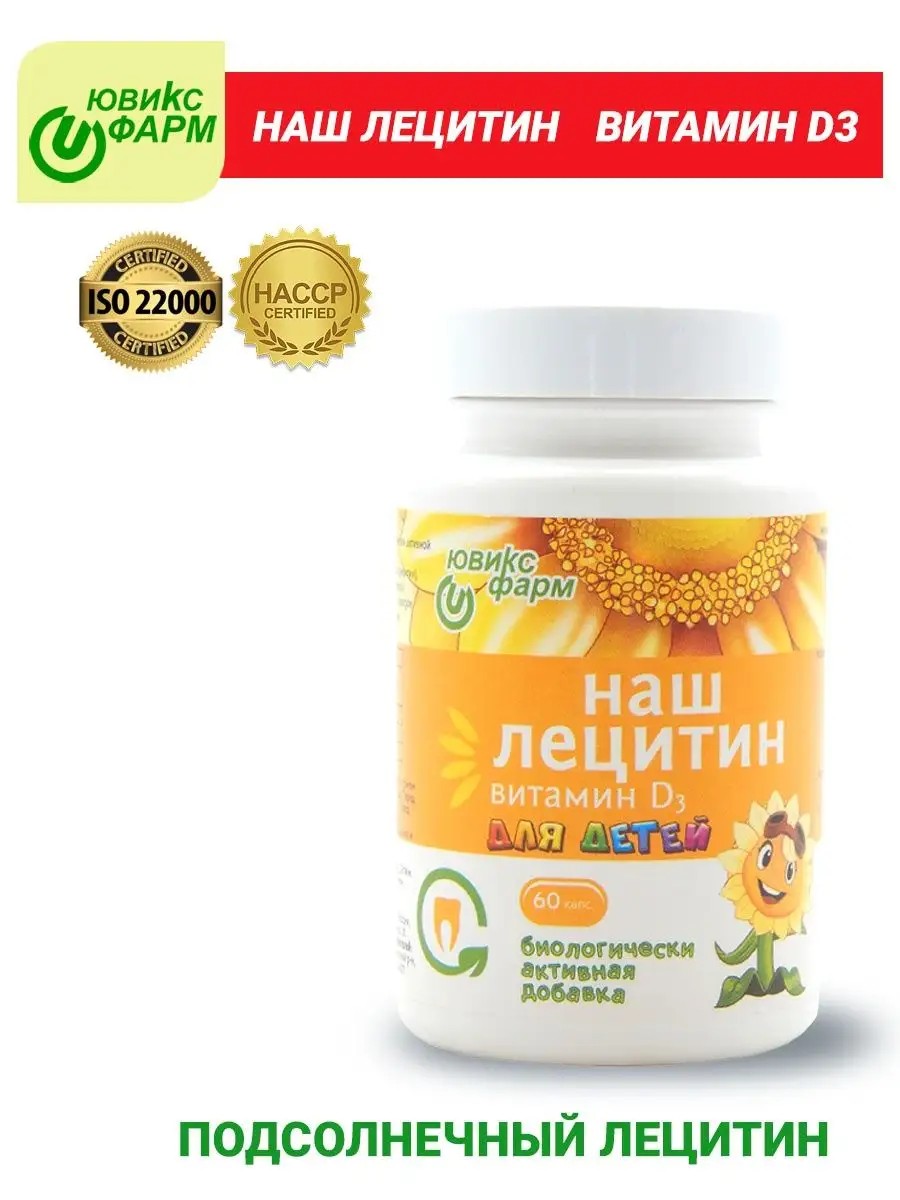 "Наш лецитин с витамином D3" (1 капсула 350 мг: лецитин из подсолнечника - 348 мг, холекальциферол - 2 мг) - дополнительный источник витамина D3, так как без солнечных лучей данный витамин практически не вырабатывается в организме. Отличное средство для профилактики остеопороза, детского рахита и повышенной хрупкости опорно-двигательного аппарата. Нормализует обмен кальция и фосфатов, позволяя кальцию полноценно усваиваться организмом и укреплять кости, делая их более ударопрочными. Без витамина D3 и фосфолипидов (составляющих лецитин) кальций практически не усваивается. Регулирует уровень вырабатываемого инсулина, а также улучшает работу надпочечников. Нормализует функциональность мочеполовой и гормональной системы как мужчин, так и женщин. Часто выступает препаратом дополнительной терапии при болезнях суставов, травм сухожилий. Оказывает помощь в восстановлении после родов и в период грудного вскармливания. Не является лекарственным средством, необходима консультация специалиста!