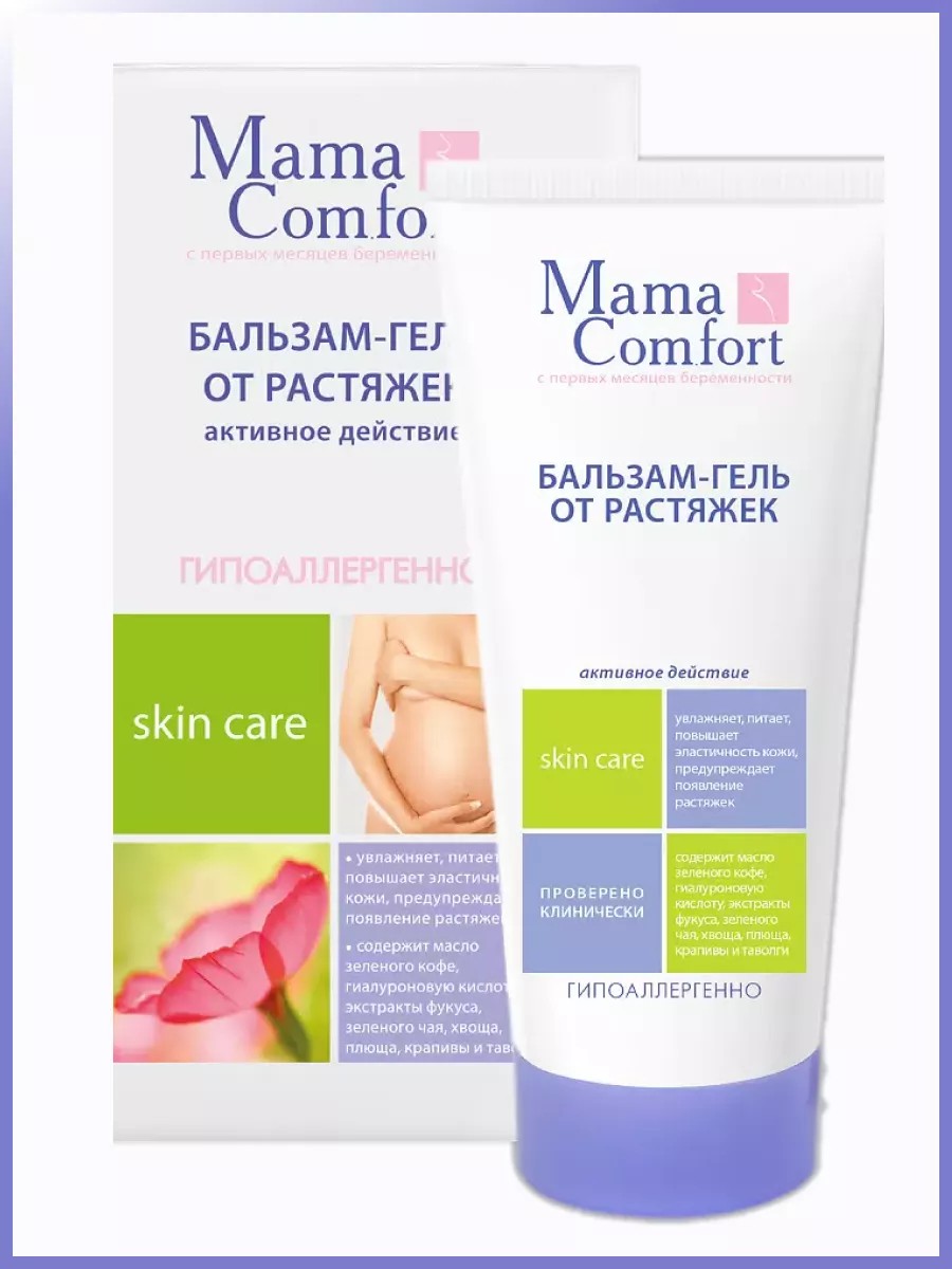 Бальзам-гель против растяжек "Mama comfort" является высокоэффективным натуральным профилактическим средством предупреждающим появление растяжек на коже живота и бедер в период беременности.- Сбалансированное сочетание биологически активных веществ интенсивно питает, увлажняет, регенерирует и разглаживает кожу.- Инновационный комплекс Reguo-stretch способствует восстановлению нарушенной структуры коллагеновых и эластиновых волокон в проблемных зонах. Гиалуроновая кислота оказывает продолжительное увлажняющее действие, удерживая воду в межклеточном пространстве кожного покрова.- Бальзам-гель предупреждает появление растяжек, нормализует состояние кожного покрова, возвращая ему эластичность и упругость, способствует уменьшению уже существующих растяжек.- Активные компоненты: Reguo-stretch, масло зеленого кофе, гиалуроновая кислота, экстракт фукуса, зеленого чая, хвоща, плюща, крапивы и таволги.- Противопоказания: индивидуальная непереносимость компонентов.