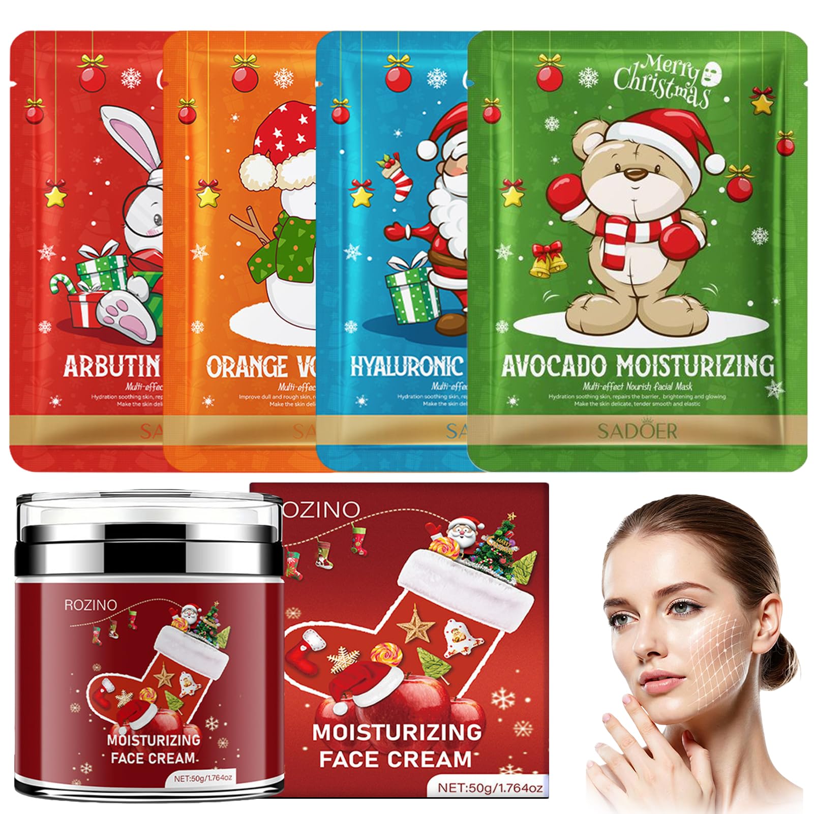 4 Pieces Moisturizing Sheet Masks 50g Moisturizing Cream, Facial Mask Set for Women, Moisturizing Mask, Soothing and Nourishing Moisturizing Mask, Christmas Skin Care Set SAFETY WARNING NoSuitable for all skin types The mild formula provides comprehensive care and deep nourishment without irritating the skin. The product has a refreshing, non-greasy texture that leaves the skin feeling relaxed and soothed. Fast Absorption The firming cream has a light texture that quickly absorbs into the skin without weighing it down. The cream is breathable and comfortable and suitable for daily moisturizing care, both day and night. Multi-Experience Set The mask set includes: Avocado Moisturizing Mask, Hyaluronic Acid Moisturizing Mask, Arbutin Mask, Sweet Orange Vitamin C Brightening Mask. This versatile mask set addresses multiple skin care needs and provides a rich skin care experience. Deep Skin Care Provides deep spa-like care for the skin: The hydrating mask and moisturizer provide double hydration. The anti-wrinkle cream penetrates deep into the skin layers, improves the complexion from within and brightens the skin color, effortlessly tackling dryness complaints that arise during winter and seasonal transitions. Christmas Gift Mask Set You will receive 4 moisturizing masks in festive packaging and 1 bottle of daily moisturizer. This complete skin care set in Christmas colors is perfect for winter and transitional seasons, as it instantly locks moisture into the skin. It is also an excellent Christmas gift for friends and family.4 Stuks Hydraterende Sheetmaskers 50g Vochtinbrengende CrèMe, Gezichtsmaskerset voor Vrouwen, Hydraterende Masker, Verzachtend en Voedend Hydraterend Maske, Kerstset voor Huidverzorging 4 Stuks Hydraterende Sheetmaskers 50g Vochtinbrengende CrèMe, Gezichtsmaskerset voor Vrouwen, Hydraterende Masker, Verzachtend en Voedend Hydraterend Maske, Kerstset voor Huidverzorging VEILIGHEIDSWAARSCHUWING NoGeschikt voor alle huidtypes De milde formule biedt uitgebreide verzorging en diepe voeding zonder de huid te irriteren. Het product heeft een verfrissende, niet-vette textuur die de huid ontspannen en gekalmeerd laat aanvoelen. Snelle absorptie De verstevigende crème heeft een lichte textuur die snel in de huid trekt zonder deze te verzwaren. De crème is ademend en comfortabel en geschikt voor dagelijkse hydraterende verzorging, zowel overdag als 's nachts. Multi-ervaringsset De maskerset bevat: Avocado Hydraterend Masker, Hyaluronzuur Hydraterend Masker, Arbutin Masker, Zoete Sinaasappel Vitamine C Verhelderend Masker. Deze veelzijdige maskerset voorziet in meerdere huidverzorgingsbehoeften en biedt een rijke huidverzorgingservaring. Diepe huidverzorging Biedt diepe spa-achtige verzorging voor de huid: het hydraterende masker en de moisturizer zorgen voor dubbele hydratatie. De antirimpelcrème dringt diep door in de huidlagen, verbetert de teint van binnenuit en verheldert de huidskleur, waardoor droogheidsklachten die tijdens de winter en seizoensovergangen ontstaan, moeiteloos worden aangepakt. Kerstcadeau-maskerset U ontvangt 4 hydraterende maskers in feestelijke verpakking en 1 flesje dagelijkse moisturizer. Deze complete huidverzorgingsset in kerstkleuren is perfect voor de winter en overgangsseizoenen, omdat het direct vocht in de huid vasthoudt. Het is ook een uitstekend kerstcadeau voor vrienden en familie.