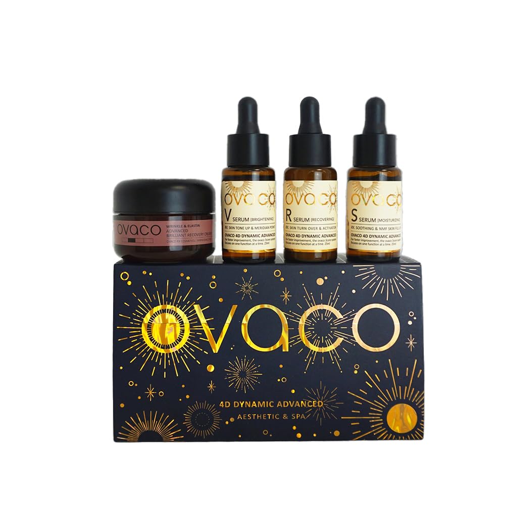 ? LIGHTWEIGHT TEXTURES FAST ABSORPTION – The serums absorb quickly without leaving a greasy residue. Used daily for 28 days, the program delivers smoother, brighter, and visibly firmer skin. PROFESSIONAL 4D KOREAN TECHNOLOGY – Inspired by advanced Korean skincare protocols, this set works on four dimensions: hydration, elasticity, radiance, and regeneration. Ideal for skin that has lost firmness or luminosity. FIRMING PEPTIDE CREAM – Enriched with peptides, EGF, and vitamin E, the cream stimulates collagen production and supports skin density. It strengthens the protective barrier and improves firmness for more toned and supple skin. 3 CONCENTRATED SERUMS FOR MULTI-DIMENSIONAL ACTION – Each serum works synergistically to improve texture, smooth fine lines, and revive the complexion's radiance. The formula combines vitamin C, glutathione, and antioxidants for visibly more even and radiant skin. COMPLETE 28-DAY ANTI-AGING PROGRAM – The Ovaco 4D Anti-Aging Set offers a professional 4-step routine designed to improve elasticity, radiance, and firmness. This intensive program combines 3 targeted serums and a peptide cream for comprehensive action on the visible signs of aging.? TEXTURES LÉGÈRES ABSORPTION RAPIDE – Les sérums pénètrent rapidement sans effet gras. Utilisé quotidiennement pendant 28 jours, le programme offre une peau plus lisse, plus lumineuse et visiblement raffermie. TECHNOLOGIE CORÉENNE PROFESSIONNELLE 4D – Inspiré des protocoles skincare coréens avancés, ce coffret agit sur quatre dimensions : hydratation, élasticité, éclat et régénération. Idéal pour les peaux en perte de fermeté ou de luminosité. CRÈME AUX PEPTIDES RAFFERMISSANTE – Enrichie en peptides, EGF et vitamine E, la crème stimule la production de collagène et soutient la densité cutanée. Elle renforce la barrière protectrice et améliore la fermeté pour une peau plus tonique et rebondie. 3 SÉRUMS CONCENTRÉS POUR UNE ACTION MULTI-DIMENSIONNELLE – Chaque sérum agit en synergie pour améliorer la texture, lisser les ridules et raviver la luminosité du teint. La formule associe vitamine C, glutathion et actifs antioxydants pour une peau visiblement plus uniforme et éclatante. PROGRAMME ANTI-ÂGE COMPLET 28 JOURS – Le Coffret Anti-Âge 4D Ovaco propose une routine professionnelle en 4 étapes conçue pour agir sur l'élasticité, l'éclat et la fermeté. Ce programme intensif combine 3 sérums ciblés et une crème aux peptides pour une action globale sur les signes visibles de l'âge.Ovaco - Coffret Anti-Âge 4D – Programme Complet Élasticité Éclat 28 Jours 3 Sérums Crème aux Peptides Soin Coréen Professionnel Raffermissant