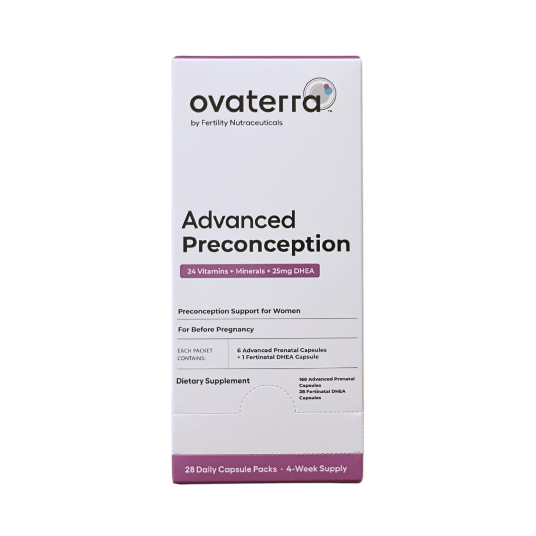 SUPPORTS FEMALE REPRODUCTIVE HEALTH FERTILITY: Our preconception vitamins for women, suitable for all females, are formulated with micronized DHEA 25mg to promote ovarian health and support the female reproductive system. Additionally, this supplement contains choline (550 mg) and folate (1,010 mcg), aiding in the support of baby's brain development. HERE TO SUPPORT YOU: As you embark on your journey toward conception and motherhood, it's essential to prioritize your health and well-being. With Advanced Preconception, our goal is to provide fertility supplements to meet the unique needs of women at every stage. Whether you're considering pregnancy, actively trying to conceive, or already expecting, we're here to support you with trusted formulations and expert guidance. Remember to consult with your healthcare provider for personalized advice and to ensure the best possible outcomes for you and your growing family. Advanced Preconception is not recommended for women with a history of hormonal cancer or estrogen-sensitive conditions such as endometriosis or PCOS. Before starting fertility supplementation, it is crucial to consult with your doctor. This formulation also includes DHA and EPA sourced from anchovy oil, which are essential Omega-3 fatty acids for fetal brain development. Please note that this product contains fish (anchovy) and may not be suitable for individuals with fish allergies. Once you receive a positive pregnancy test, discontinue using this product and switch to Ovaterra's Advanced Prenatal formula, which does not contain DHEA. DOCTOR RECOMMENDED FOR WOMEN OF ALL AGES: Women of various age groups, specifically those aged 35-39, have unique preconception supplement needs. Traditional prenatal vitamins for women may not fully meet these requirements. Advanced Preconception is tailored to address these specific needs. These doctor-recommended conception fertility support vitamins are formulated with specific dosages and optimal forms for enhanced absorption, ensuring support for women at any stage of their journey. 24 KEY VITAMINS AND MINERALS: Advanced Preconception isn't simply a DHEA supplement for women it's enriched with 24 essential prenatal multivitamins and minerals, including vitamin C, D, A, and B complex vitamins. This comprehensive blend lays the groundwork for a healthy pregnancy.