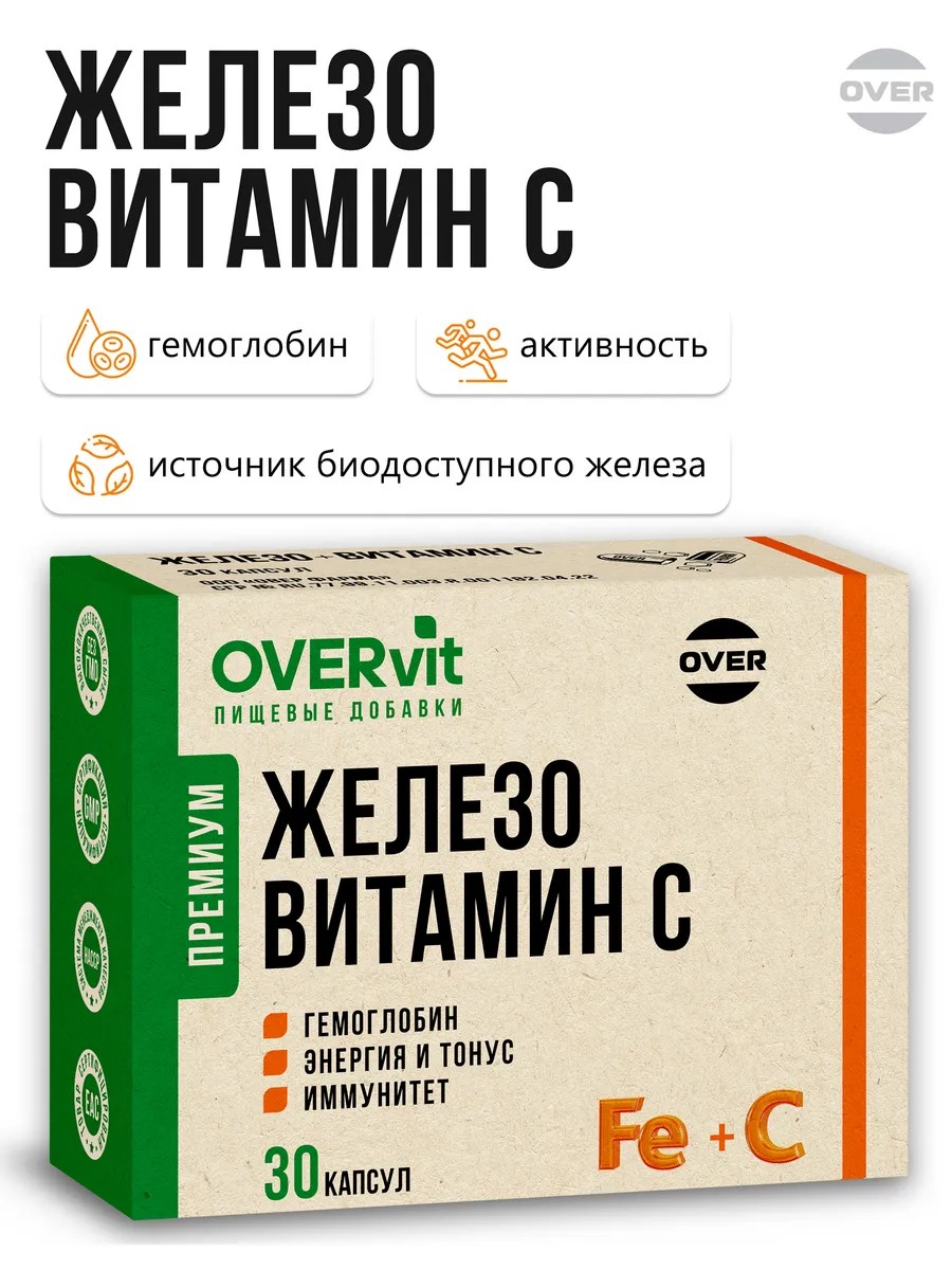 Железо - один из ключевых минералов для нашего здоровья, который играет важную роль в поддержании энергии. Если вам знакомы такие состояния как повышенная утомляемость, постоянная усталость и слабость, это может свидетельствовать о недостатке железа в организме. Комплексная пищевая добавка от Over, содержащая железо и витамин С, создана специально для восполнения дефицита этого важного минерала. Добавка включает железо в форме железа фумарата, что обеспечивает высокую усвояемость и биодоступность. Преимуществом данного продукта является его состав, усиленный витамином С, который помогает улучшить всасывание железа. Совместное употребление железа и витамина С способствует поддержанию нормального уровня гемоглобина, повышению работоспособности, укреплению иммунитета, а также улучшению состояния кожи и волос. Витамины и бады от OVER - это высококачественные продукты, дополняющие Ваш образ жизни и физическое здоровье. Вся продукция сертифицирована, мы обеспечиваем самые высокие стандарты качества продукции в процессе её создания, хранения и транспортировки.