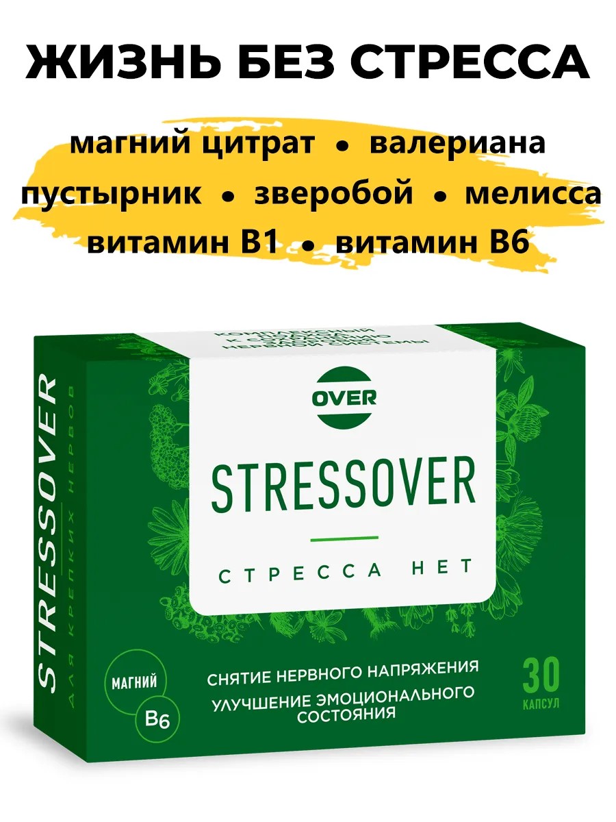 Успокоительное STRESSOVER - это натуральная биологическая активная добавка на растительной основе, созданная для борьбы со стрессом и тревогой. Благодаря натуральным компонентам препарат деликатно и мягко воздействует на организм человека. В составе капсул присутствуют такие компоненты, как валериана и пустырник, которые успокаивают нервную систему, снижают тревожность, повышают стрессоустойчивость организма. Магний, витамин В-комплекса поддерживает нервную систему, улучшает настроение и повышает энергию, особенно магний в6 полезен для сердца: магний цитрат снижает риск сердечно-сосудистых заболеваний, снимает утомляемость, мышечные спазмы и судороги. Витамины группы B (В1 и B6) положительно влияют на усвоение магния организмом. Природным антидепрессантом является зверобой - пищевые добавки в составе с этим экстрактом помогут справиться с бессонницей и стрессом. Мелисса благоприятно влияет на нервную систему, успокаивает, обеспечивает здоровый сон, избавляет от стресса и тревоги. Успокоительное STRESSOVER рекомендуется для взрослых мужчин и женщин, которые страдают от повышенной тревожности, стресса, депрессии или усталости. Комплекс поможет в улучшении качества сна и общего состояния эмоционального здоровья. Натуральный состав и наличие магния, витаминов и растительных экстрактов, делают этот БАД эффективным в борьбе со стрессом и усталостью.