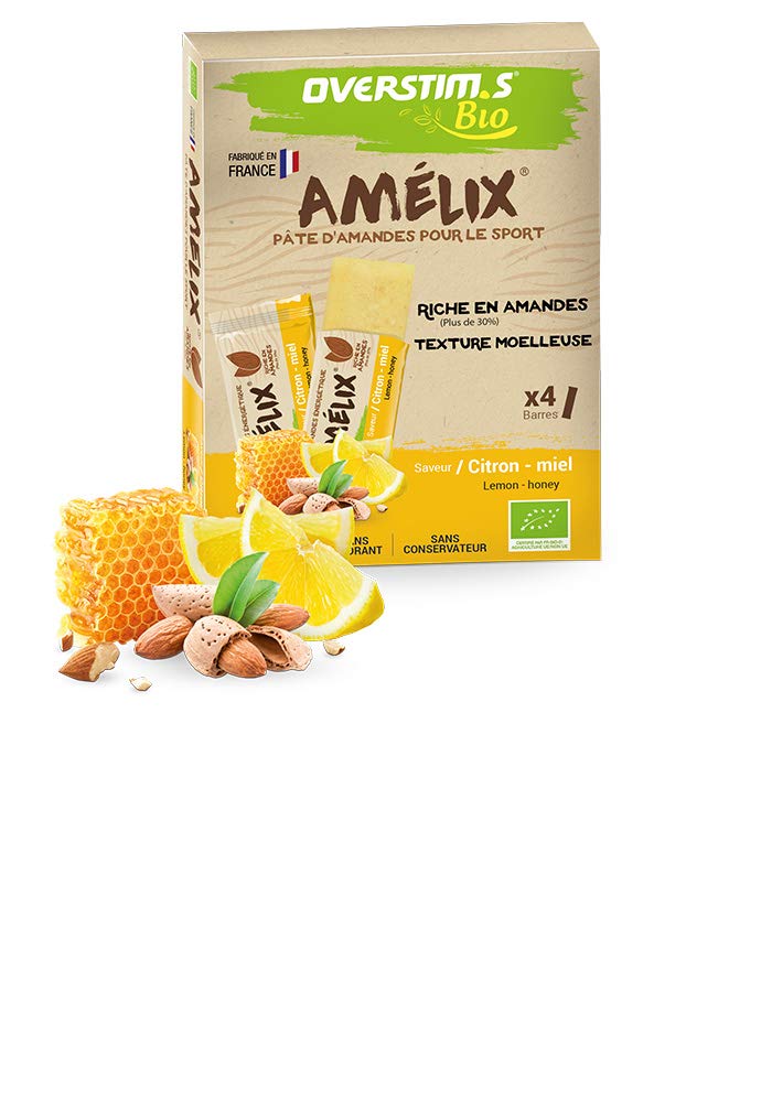 Organic Amelix almond paste provides you with delicious and natural energy. The nutritional richness of organic Amelix helps maintain your efficiency throughout your sports practice. It is particularly suitable for prolonged efforts. INGREDIENTS Lemon - Honey: organic cane sugar, organic almonds 33 , organic candied lemon 16 (organic lemon peel, organic cane sugar, organic rice syrup), organic honey 8.1 , water, natural lemon flavoring, salt. Made in a factory that uses: nuts, gluten, soy, sesame and lactose.Made in France: OVERSTIM.s boasts over 35 years of experience in sports energy. OVERSTIM.s products are designed and manufactured in France (Brittany) by a team of enthusiasts. Soft and melting texture. Delicious and delicious. Rich in organic almonds ( 30 ). Soft energy bar. La pate d'amandes amélix bio vous apporte une énergie gourmande et naturelle. La richesse nutritionnelle de l'Amélix bio permet de maintenir votre efficacité tout au long de votre pratique sportive. Elle est particulièrement adaptée pour les efforts prolongés. INGRÉDIENTS Citron - Miel : sucre de canne bio, amandes bio 33 , citron confit bio 16 (écorces de citron bio, sucre de canne bio, sirop de riz bio), miel bio 8,1 , eau, arôme naturel de citron, sel.Fabriqué dans un atelier qui utilise : fruits à coque, gluten, soja, sésame et lactose.Fabrique en France: OVERSTIM.s, c'est plus de 35 ans d'expérience de l'énergie sportive. Les produits OVERSTIM.s sont conçus et fabriqués en France (Bretagne) par une équipe de passionnés. Texture moelleuse et fondante. Gourmande et savoureuse. Riches en amandes bio ( 30 ). Barre énergétique moelleuse.