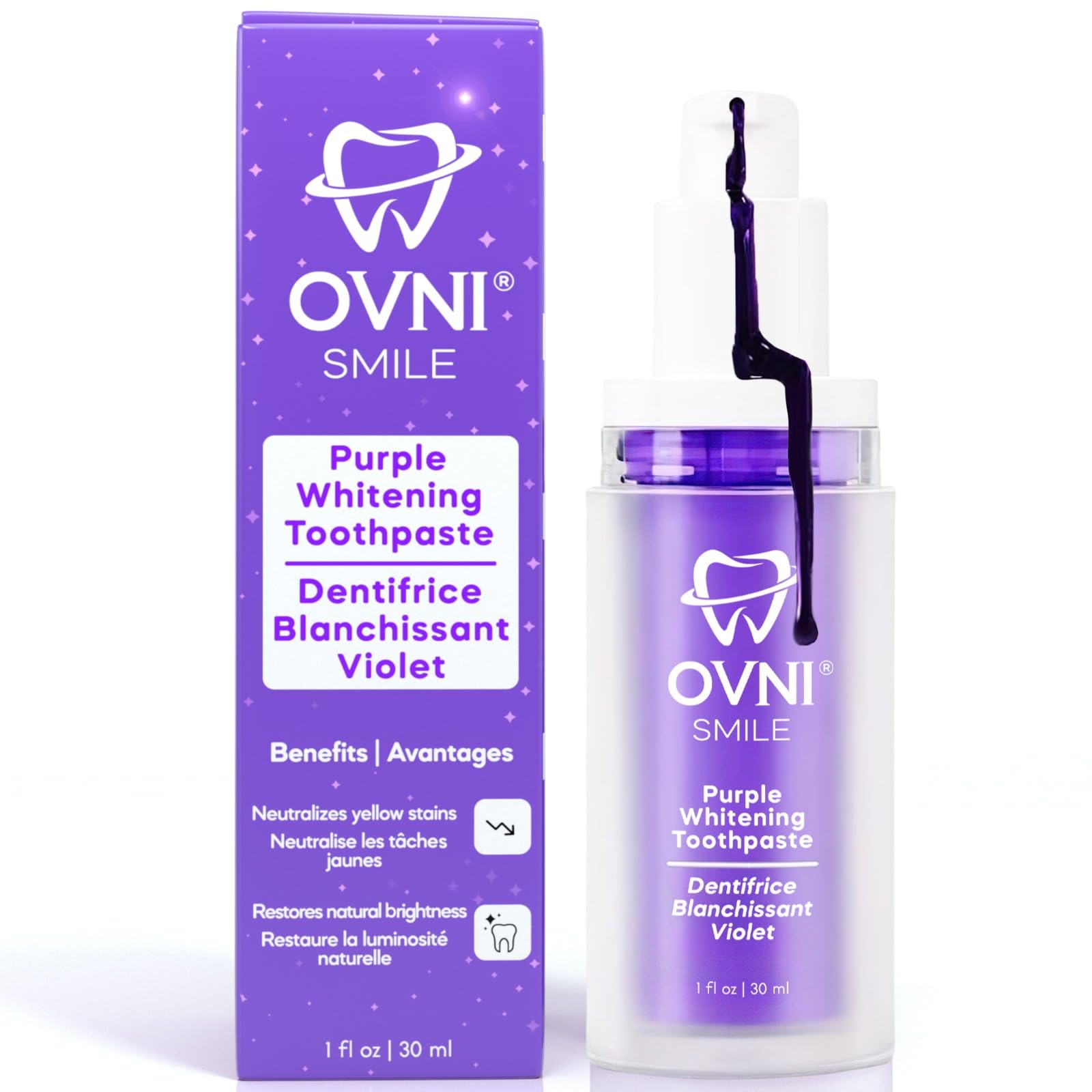 BRIGHTEN YOUR SMILE ANYWHERE, ANYTIME: Whether you're at home or on the move, Ovni Smile is your trusted companion for on-the-go teeth whitening. This travel-friendly purple toothpaste provides fast, effective results in just 2 minutes, making it easy to maintain a luminous smile no matter where life takes you. CONSISTENCY IS KEY: Unlock Lasting Whiteness with OVNI - For a smile that truly stands out, making Ovni Smile a part of your daily routine is essential. Our toothpaste is more than a whitening product it's a testament to the power of consistency, backed by consumer-tested success stories. With up to at least 30 uses per tube, each application not only combats new stains but also upholds your smile's dazzling whiteness, ensuring you can smile with confidence!. EMBRACE THE COMFORT OF ADVANCED WHITENING: Ovni Smile redefines comfort in teeth whitening. Our unique formula, enriched with revolutionary purple corrector technology, is designed to protect your enamel and gums while effectively erg discolorations. It's not just about achieving a whiter smile it's about doing so in a way that's completely free from pain and sensitivity, thanks to our commitment to safety and effectiveness. GENTLE YET EFFECTIVE: ?Ovni's Advanced Whitening Formula - With Ovni Smile, experience the perfect blend of safety and performance. Our formulated, peroxide-free purple toothpaste ensures a pain-free teeth whitening experience without compromising on results. It's the epitome of our commitment to combining cutting-edge technology with the utmost care for your dental health, offering a solution that outshines and outperforms competitors. DISCOVER THE POWER OF PURPLE: Ovni Smile's Whitening Revolution - Step into the future of teeth whitening with Ovni Smile's revolutionary purple toothpaste. Our groundbreaking formula goes beyond traditional whitening methods, using advanced purple corrector technology to neutralize yellow tones and reveal a brighter, more radiant smile. This innovative approach, promises and delivers visible results, setting a new standard in teeth whitening efficacy.