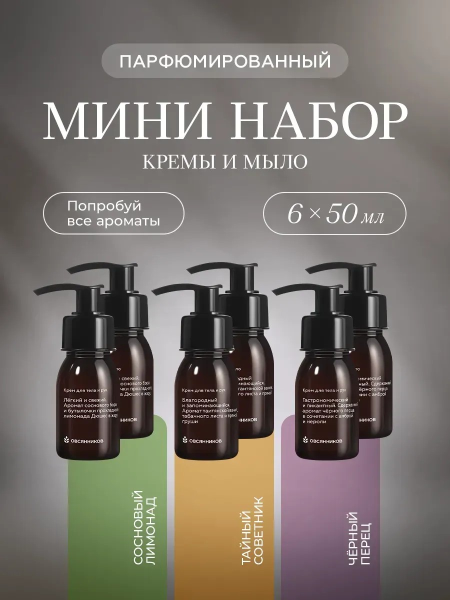 The Ovsyannikov gift set includes creams and soaps in three fragrance series: Secret Advisor, Black Pepper, and Pine Lemonade. The mini hand cream and mini soap will provide complete hand care.