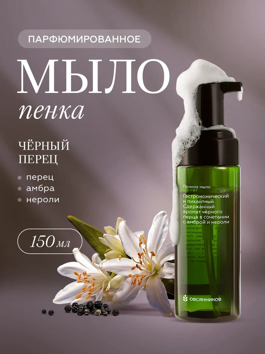 Пенное мыло Овсянников – это идеальное сочетание очищения и ухода за вашей кожей, а яркий аромат серии Черный перец останется с Вами надолго.