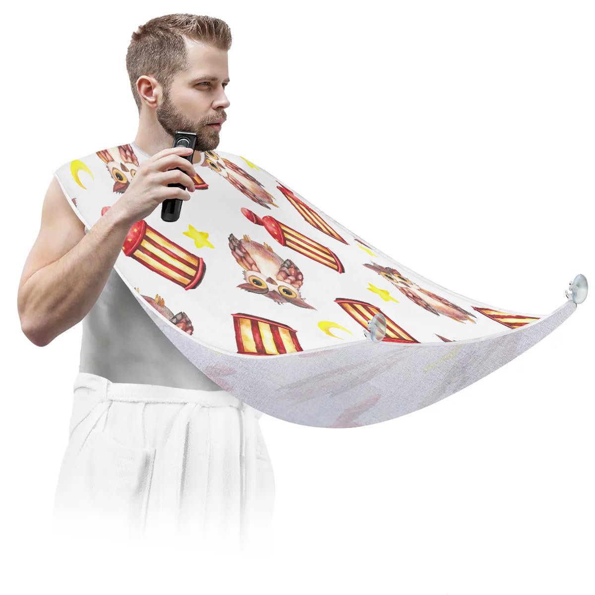 fiber fabric, ensuring exceptional quality. The fabric has a smooth and soft surface that is not sticky to hair, making it comfortable to wear during grooming sessions. It is also waterproof and anti-static, further enhancing its practicality. In addition, it is equipped with two high-quality suction hooks that provide powerful suction without leaving marks on mirrors or tiles. ?Convenient and Easy to Use?: Using our beard hair catcher is a breeze. Just fasten it around your neck using the adjustable strap and secure it to the mirror. Once in place, you can effortlessly proceed with your regular grooming routine. When you're done, simply remove the beard bib from the suction cups. Then brush the collected hair into the trash can for easy cleanup. ?Effortless Hair Cleanup?: Our Owl Moon Star beard bib is expertly designed to capture all loose beard hair, mustache, and sideburn trimmings, providing effortless cleanup and keeping your sink immaculately clean. This saves you valuable time that would otherwise be spent on tedious cleaning tasks. Not only does it serve a practical function, but it also adds a stylish touch to your daily grooming routine.