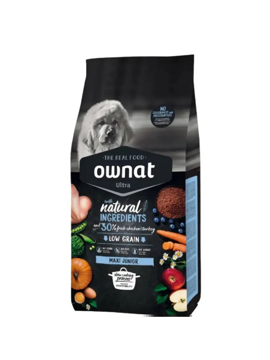 OWNAT ULTRA. MAXI JUNIOR – это сбалансированное питание для щенков крупных пород, произведённое в Испании. В основе корма лежит максимальное количество натуральных ингредиентов: свежее мясо, цельное зерно, свежие овощи и фрукты, а также водоросли, что позволяет донести до питомца пользу продуктов в том виде, в каком задумала природа.