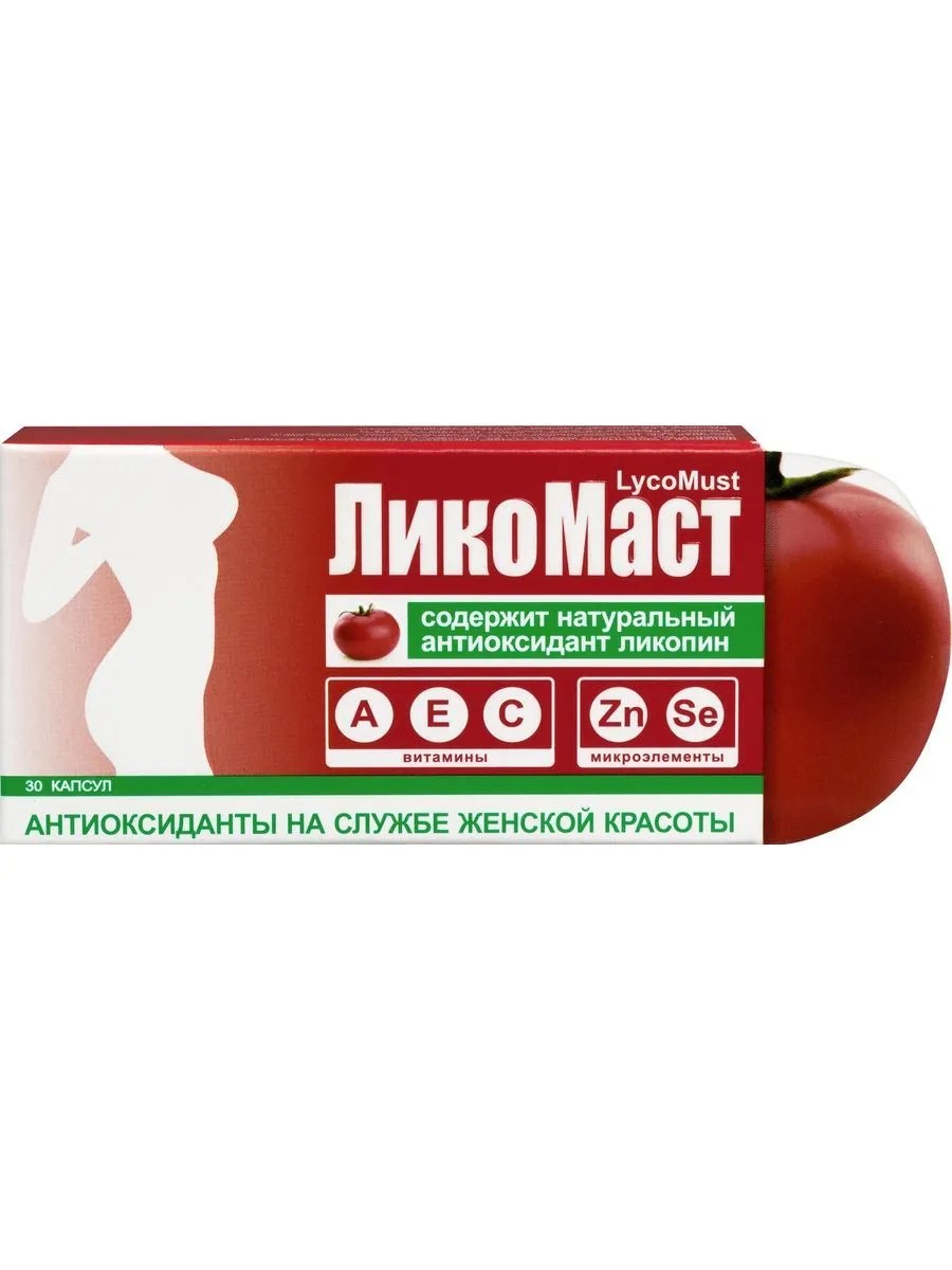 Likomast n30 caps. antioxidant. As a dietary supplement - an additional source of lycopene, vitamins A, E, C; microelements - zinc and selenium. Lycopene - 5.0 mg, vitamin A palmitate - 2500 IU, vitamin E acetate - 10 IU, ascorbic acid - 50 mg, zinc sulfate monohydrate - 27.45 mg, selenium dioxide monohydrate - 70 mcg; excipients: soybean oil, emulsifier, soy lecithin E322, hydrogenated vegetable oil. For sale through pharmacies and use. The information on the labeling is agreed with the Ministry of Health of the Republic of Belarus (letter dated 03.19.2013 No. 14-18-01 / 294)