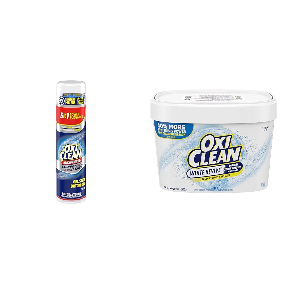 OxiClean Maxforce Gel Stick, Chlorine Bleach-Free, Fragrance-Free, 183 mL Fight the toughest stains with ease with the OxiClean MaxForce Gel Stick Pre-Treater Stain Remover. This extra strength formula has the power of 5 stain removers in one convenient gel to penetrate the toughest dried on stains. The five powerful stain removers each target different types of stains to: 1) lift food stains from fabric, 2) dissolve and trap grease and oil, 3) bind to dirt and soils to suspend and rinse them away, 4) target protein stains like grass and blood and 5) help break down food thickeners like those found in ice cream. Simply apply the gel stick directly onto the stain. Its stain-scrubbing nubs do the work for you, working the gel deep into set-in stains. No need to rush to the washing machine; you can wash your laundry up to seven days after it's been treated! OxiClean MaxForce Gel Stick Pre-Treater Stain Remover has all the stain-fighting power you need without any chlorine bleach. This colour-safe gel harnesses the power of oxygen to get tough stains out. Read warnings and full directions on product label before use. Check out our full family of in-wash powder and liquid stain removers and targeted pretreaters. Rest easy that your laundry is under control with OxiClean. OxiClean White Revive Laundry Stain Remover Powder, 1.28-kg Bring back brilliant whites with OxiClean White Revive Laundry Stain Remover Powder. This powerful stain remover revives your dingy white clothes, keeping them looking like new longer. White Revive whitens 40% better than chlorine bleach with no chlorine bleach or smell, and it’s safe on colours. This laundry whitener and stain remover in one harnesses the power of oxygen to get tough stains out and rinse them away. It's great for removing a broad range of stains including dirt, grease, food, blood, wine and makeup. OxiClean White Revive Laundry Stain Remover Powder is compatible with both standard and high efficiency (HE) washing machines. Read warnings and full directions on product label before use. Check out our full family of in-wash powder and liquid stain removers and targeted pretreaters. Rest easy that your laundry is under control with OxiClean.Follow instructions for best results: Apply MaxForce Gel Stick directly on stains, rub in, wait 5-30 minutes, then wash with detergent. Add White Revive Powder to laundry. MaxForce Gel Stick comes with a special applicator to work the gel deep into stains, while White Revive Powder is added to the laundry. Both products are chlorine bleach-free, color-safe, and designed to get tough stains out the first time. OxiClean White Revive Laundry Stain Remover Powder (1.28-kg) provides 40% better whitening than chlorine bleach while reviving and maintaining brilliant whites and removing tough stains. OxiClean MaxForce Gel Stick (183 mL) has the power of 5 stain removers in 1 oxygen-based formula to remove tough stains like grease, oil, grass, blood, soil, clay, tea, and gravy from laundry.